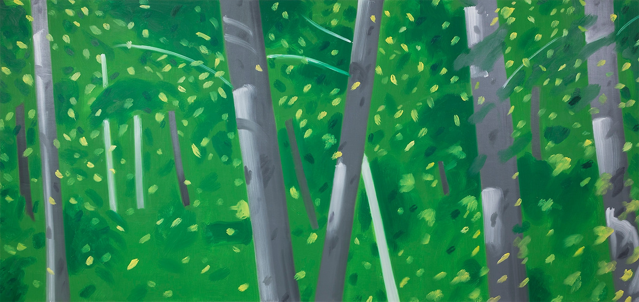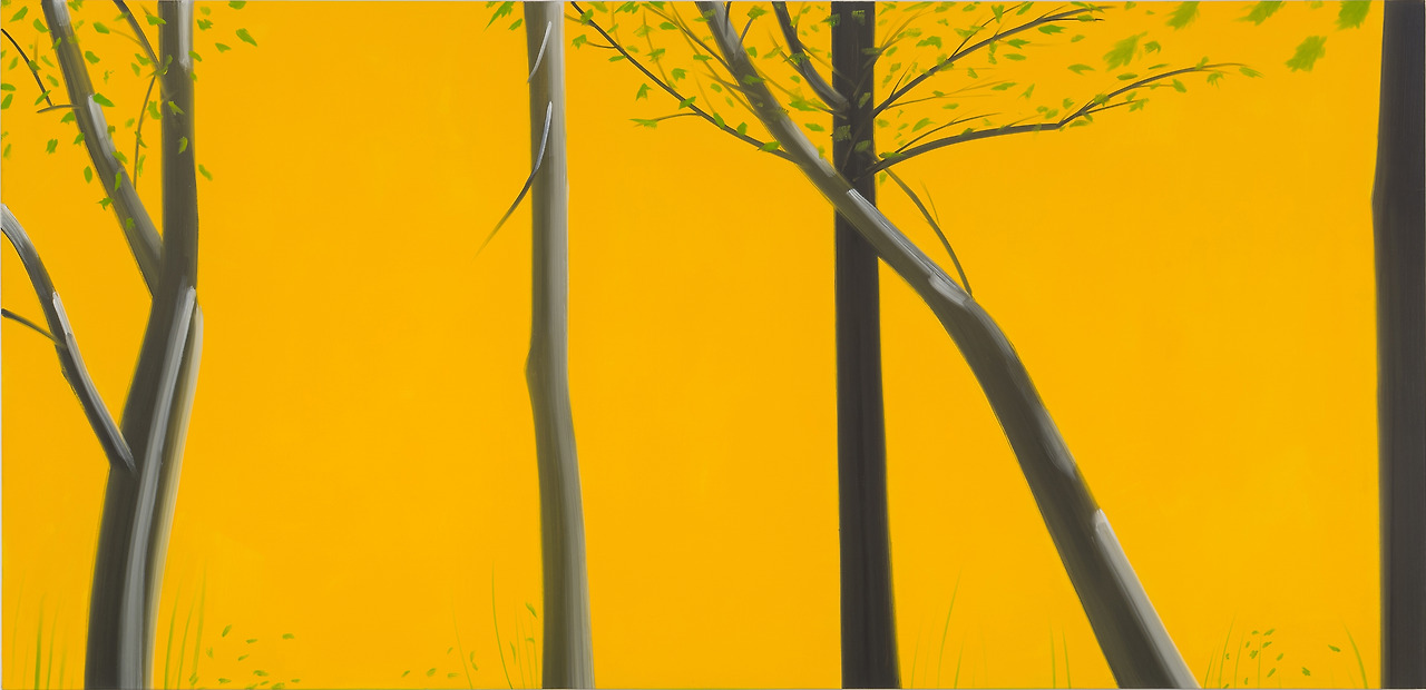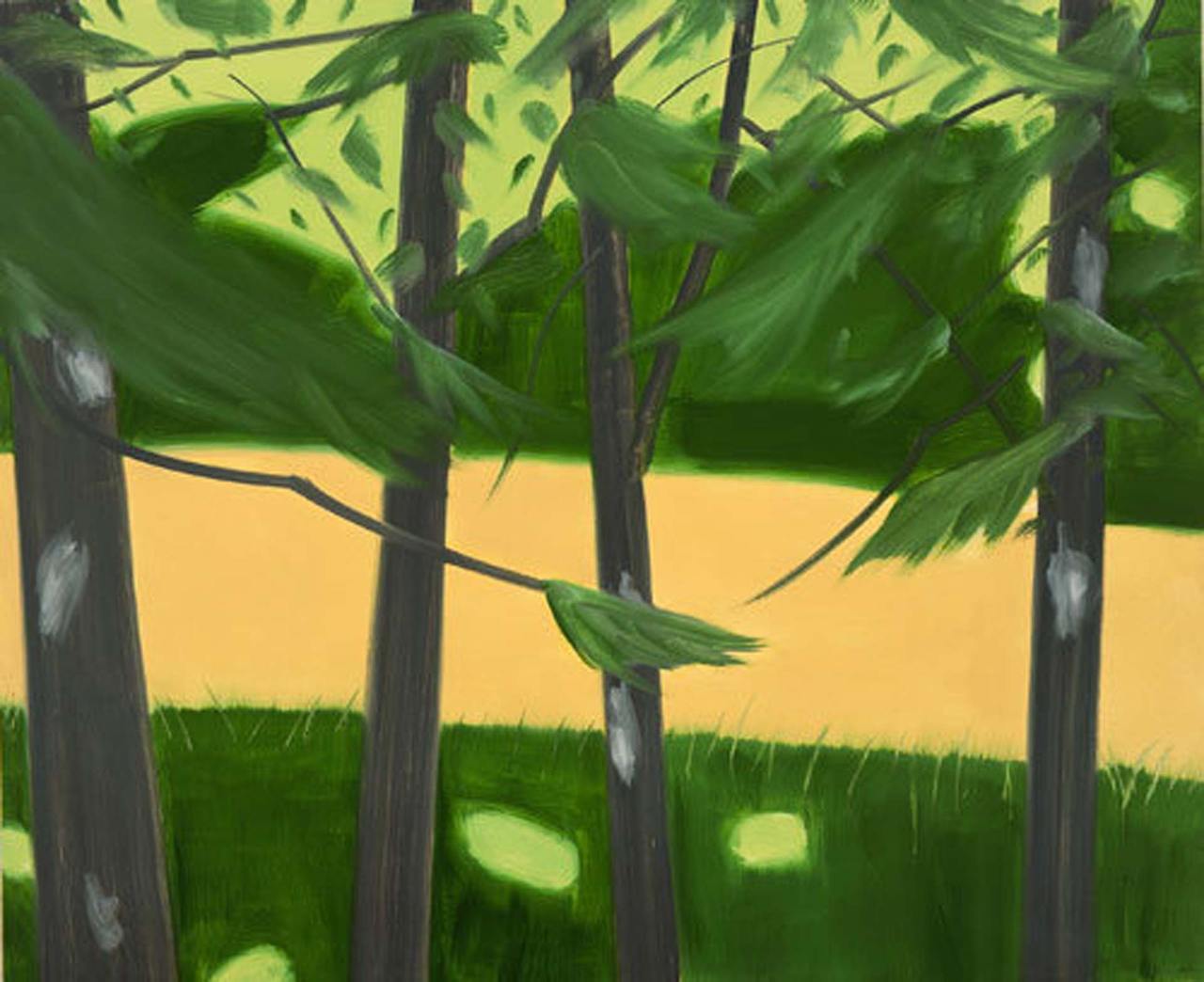 크기가 2.3m, 4.2m에 달하는 1991년 작품은 청명한 여름의 숲으로 보인다. 화면으로 보아 감이 잘 안 오겠지만 그 앞에 서면 햇살이 아른거리는 깊은 숲 속에 들어온 착각을 불러일으킬 것이다. 회고전(1986) 이후 카츠는 이렇게 벽면을 채울 정도로 큰 ‘환경 풍경화(environmental landscapes)’ 제작에 몰두했다. 관객은 특정 공간, 특정 계절과 시간에 화가가 직관적으로 포착한 순간의 인상과 빛의 세례를 감각할 수 있다. <네 그루의 나무>는 빠른 붓질이 눈길을 끄는데, 그로 인해 바람에 날리는 나뭇잎의 움직임이 느껴진다. 카츠의 나무 그림은 이렇듯 나무의 일부, 토르소에 해당하는 몸통이나 가지를 초점으로 하는 경우가 많다. 제목에 명시되지 않았지만, 어둑한 초록잎과 노란빛의 강물은 이때가 늦은 오후임을 암시한다.