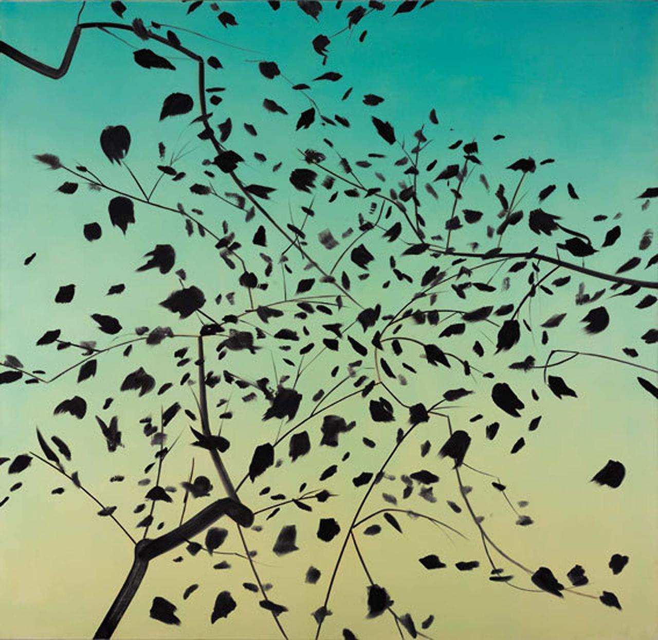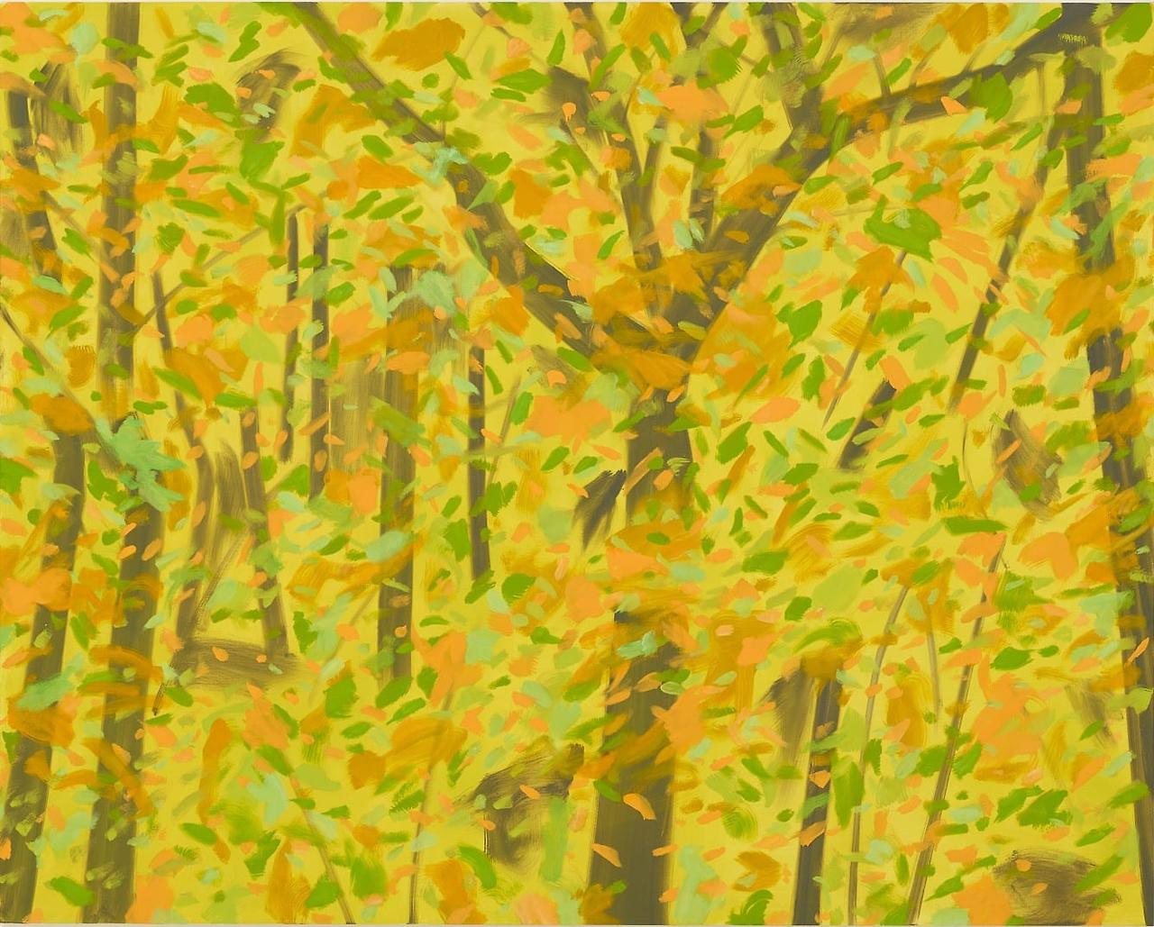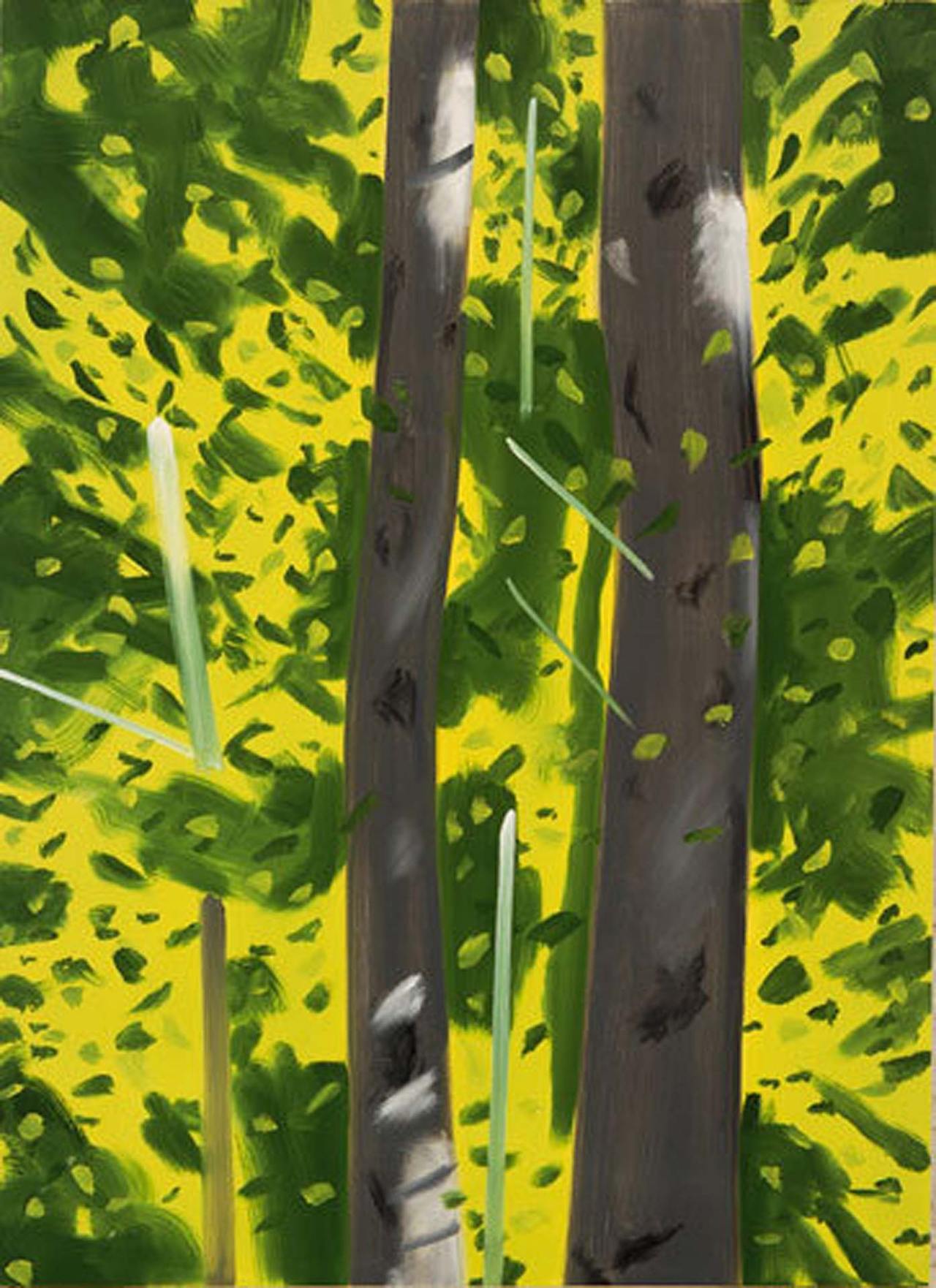 크기가 2.3m, 4.2m에 달하는 1991년 작품은 청명한 여름의 숲으로 보인다. 화면으로 보아 감이 잘 안 오겠지만 그 앞에 서면 햇살이 아른거리는 깊은 숲 속에 들어온 착각을 불러일으킬 것이다. 회고전(1986) 이후 카츠는 이렇게 벽면을 채울 정도로 큰 ‘환경 풍경화(environmental landscapes)’ 제작에 몰두했다. 관객은 특정 공간, 특정 계절과 시간에 화가가 직관적으로 포착한 순간의 인상과 빛의 세례를 감각할 수 있다. <네 그루의 나무>는 빠른 붓질이 눈길을 끄는데, 그로 인해 바람에 날리는 나뭇잎의 움직임이 느껴진다. 카츠의 나무 그림은 이렇듯 나무의 일부, 토르소에 해당하는 몸통이나 가지를 초점으로 하는 경우가 많다. 제목에 명시되지 않았지만, 어둑한 초록잎과 노란빛의 강물은 이때가 늦은 오후임을 암시한다.