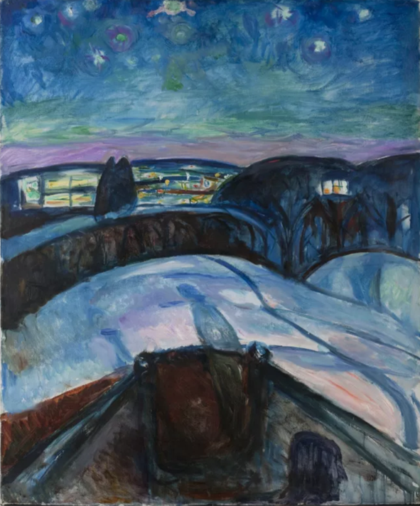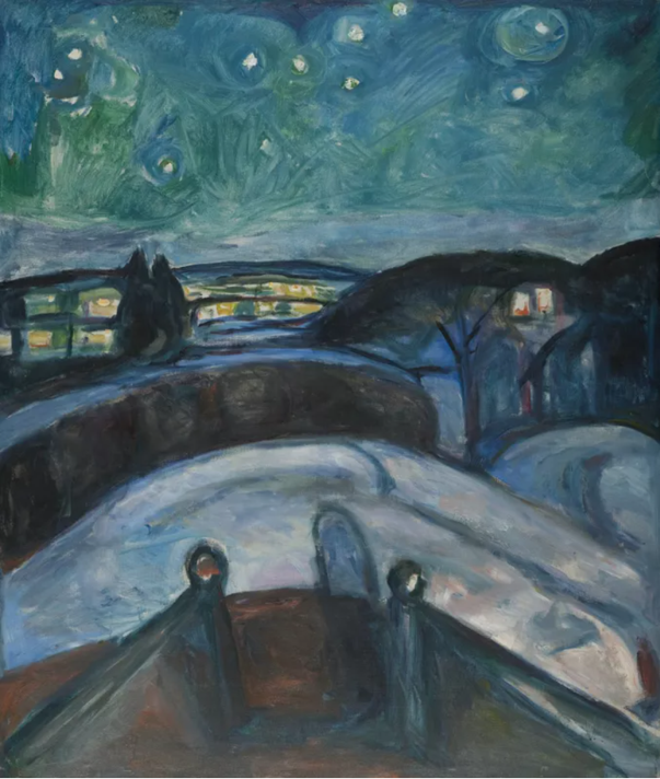 다시 뭉크의 <별이 빛나는 밤>으로 돌아가 보니 신비로운 한 여름밤의 꿈같은 풍경만으로만 보이지 않는다. 대지의 붉은 색감과 날이 선 붓질, 울타리에 어른거리는 남녀의 그림자 때문인지 사랑으로 인한 화가의 고통과 갈망, 쓸쓸한 외로움이 동시에 느껴진다. 뭉크는 별이 빛나는 한밤의 해변 풍경이 불러일으켰던 그때의 감정을 포착했던 것이다.