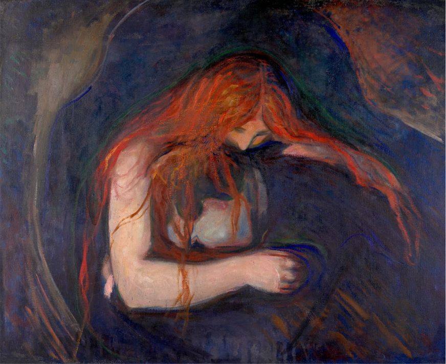 이 시기에 그린 <창가에서의 키스>는 늦은 밤 집안에서 열정적인 키스를 하는 연인을 보여준다. 유부녀와 밀회를 나누었던 뭉크의 기억이 반영되었는지 격정적이면서도 불안한 분위기다. <사랑과 고통>에서 이제 여성은 남자의 피를 빨아먹는 뱀파이어로 등장한다. 그녀의 붉은 머리카락은 남성을 옥죄고 벽에 그림자는 악령처럼 커플을 감싼다. 이 시기의 작품 <칼 요한 거리의 저녁>(1892), <병실에서의 죽음>과 <절규>(1893) 등은 그의 생애에서 가장 어둡고 불안한 감정을 표현하고 있다.