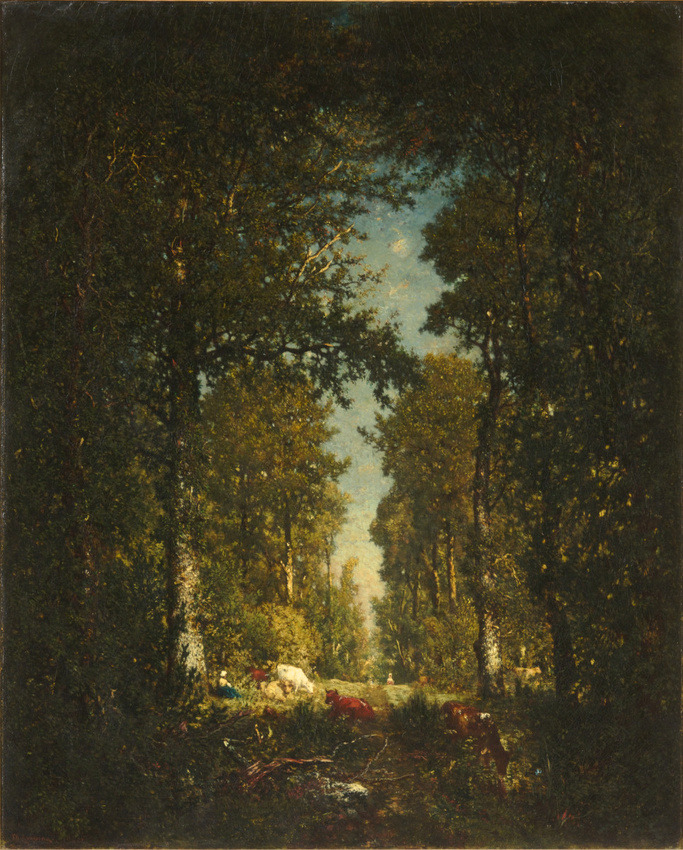 루소가 릴라덩(L'Isle-Adam)에 머물며 그린 수직의 풍경화는 양쪽에 늘어선 나무들 때문에 ‘초록 거리’로도 불린다. 전경에 어두운 숲과 쨍한 빛이 깃든 원경이 대조를 이루며 꿈결처럼 아련한 인상으로 다가온다. 중경에는 쉬고 있는 양치기 소녀와 소들이 보인다. 루소가 묘사한 숲은 다양한 생명이 공존하는 터전이자 생동하는 힘과 조화로운 에너지로 가득한 공간이다. 거기에서 인간은 거대한 자연의 품에 안긴 미세한 존재에 지나지 않는다.