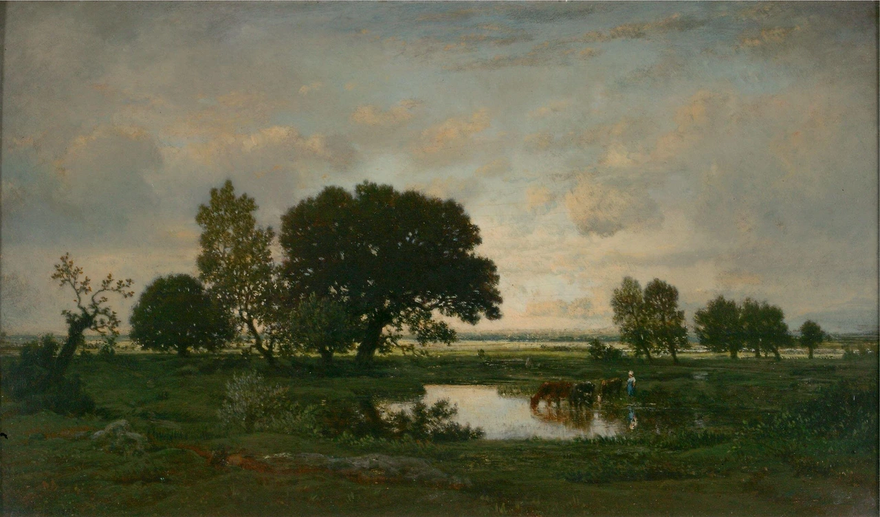 공식적으로 인정받으며 다작하던 1850년대 루소는 평온하고 서정적인 작은 풍경화도 그렸다. 위의 두 작품은 낮은 지평선과 하늘의 구름, 물가의 나무들까지 비슷한 구성을 보여준다. 인간도 한 점의 붓질로 풍경에 스며들어 있다. 보다 정교한 묘사와 완결된 구성을 보여주는 이 그림들은 화가가 흠모했던 17세기 네덜란드 풍경화와 유사하다. 루소는 루브르 미술관에서 야코프 반 로이스달(1628/29~1682)과 얀 반 호엔(1596-1656) 등의 작품을 연구했을 뿐만 아니라 17세기 네덜란드 풍경 판화를 다수 소유하고 있었다. 유사한 작품이 많아 화가가 작업실에서 변주하며 제작한 것으로 추정된다.