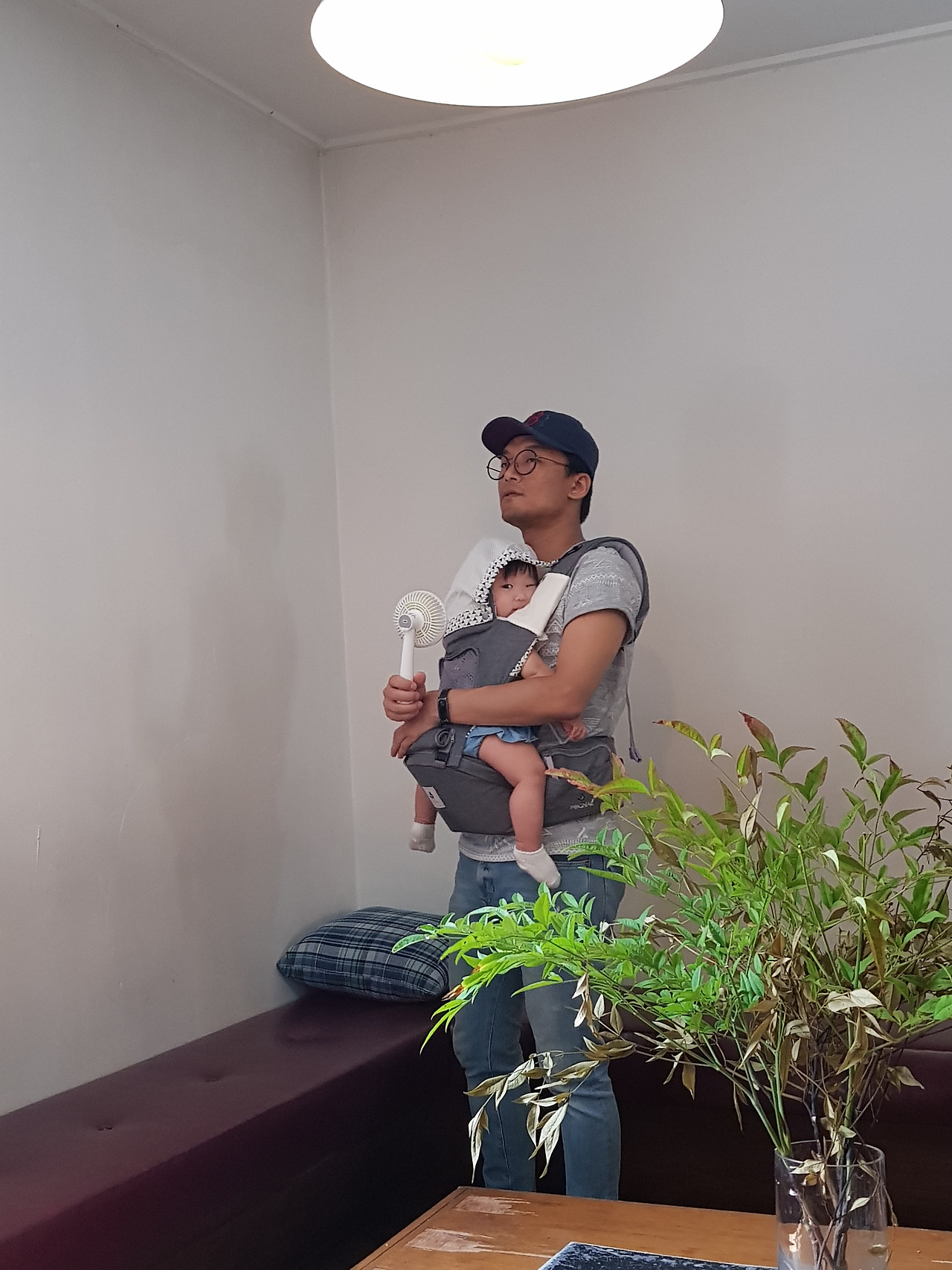 아이의 잠잘 채비를 하고 젖을 물리려던 찰나, 생각보다 일이 빨리 끝나 서둘러 집에 오고 있다고 거의 다 왔다는 남편의 연락. 잠들려던 아이를 안고 나와 현관 앞에 섰다. 띠띡- 현관문에 들어선 남편이 딸의 얼굴을 보자 미소가 환하게 번져온다. 해인이도 마주 웃어준다.