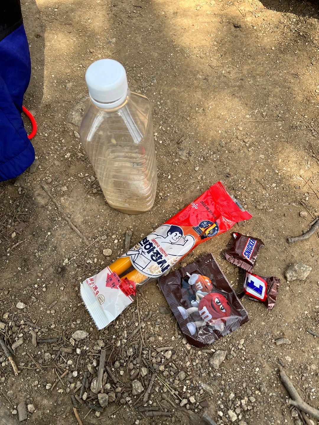 우리가 싸왔던 올망졸망한 간식들. 근데 다 필요 없고 산 입구에서 샀던 얼린 믹스커피가 짱이었다. 이거 없었으면 정상 못 올라갔다. 최고의 당 충전.