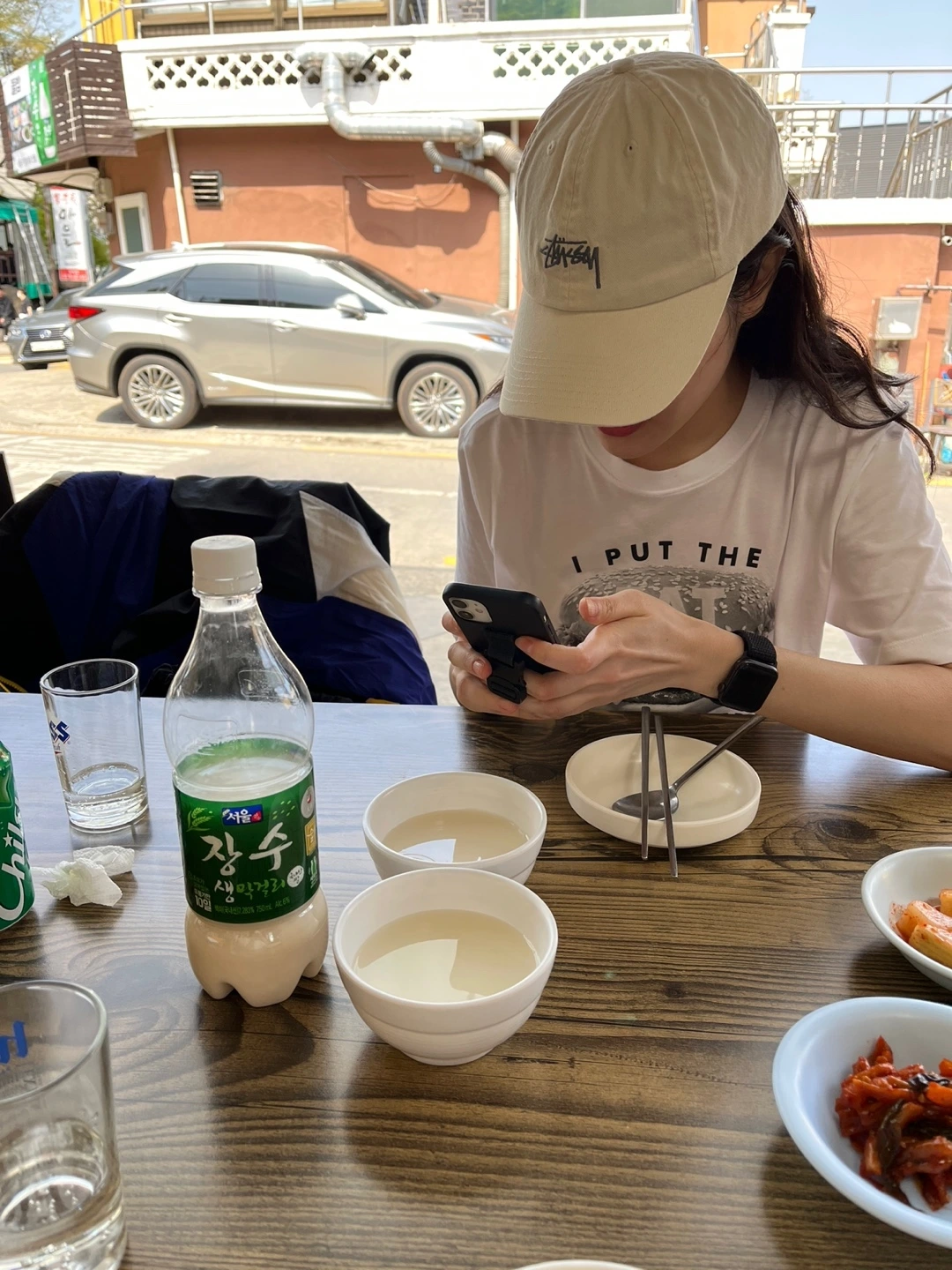 너무 심하게 좋은 날씨와 예쁜 꽃들에 열받아하며 등산을 마친 후 야외에서 막걸리를 마셨다. 깍두기만 안주로 해서 먹어도 충분히 가득 찬 맛.