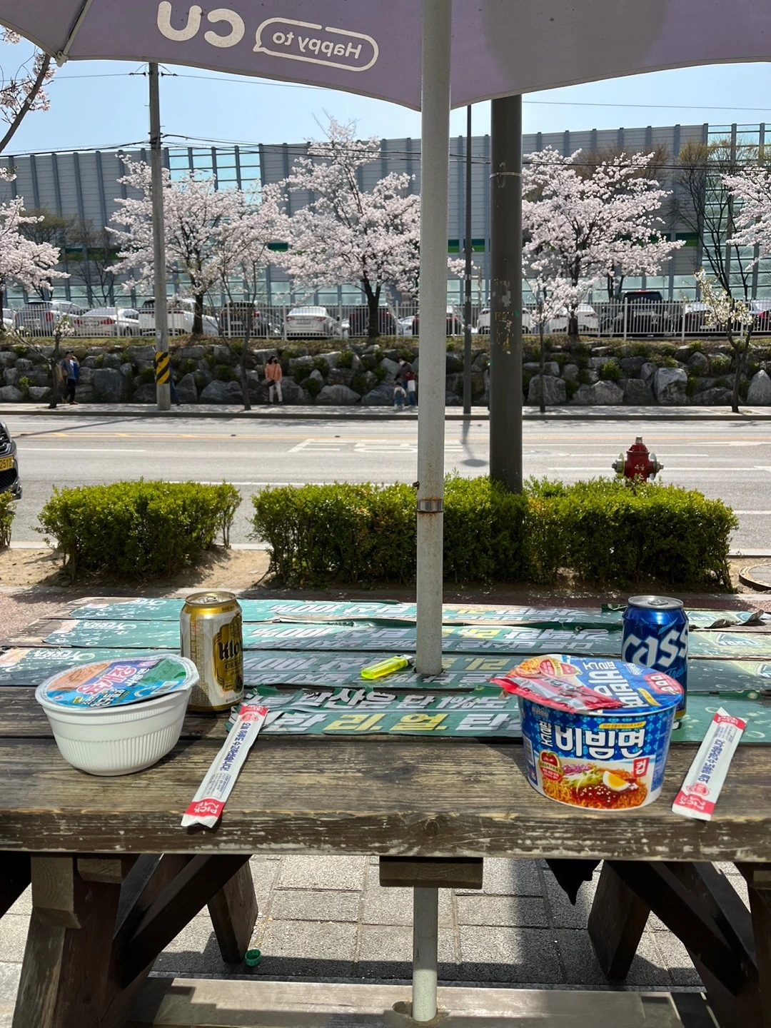 열받는 김에 아주 대놓고 벚꽃을 쳐다보며 편의점 앞 벤치에 앉아 라면과 맥주로 2차를 했다. 흩날리는 벚꽃이 어찌나 열받든지.. 그러나 훌륭한 한상 차림이었다. 방금 먹은 막걸리를 라면으로 해장하며 맥주를 마셨다.