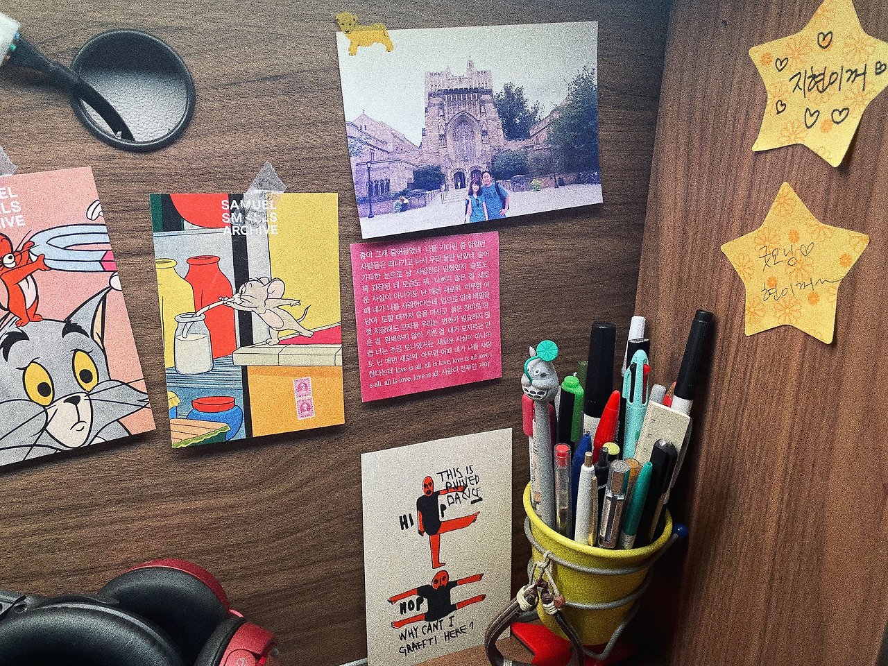 내가 집에서 가장 많은 시간을 보내는 의자에 앉아 방을 한 바퀴 돌아본다. 산만하기 짝이 없다. 온갖 엽서, 쪽지, 사진 등등이 방 곳곳에 붙어있다. 떠들썩하기는 회사에서의 내 자리도 마찬가지다. 자리로 놀러 온 사람들은 내 책상을 둘러보곤 말한다. 누가 봐도 이 회사 오래 다닐 것 같다, 야. 다소 모욕적인 이 말에도 거세게 항변할 수 없는 건 그만큼 실제로 책상 위에 벌여놓은 것들이 많아서인데, 그중 팔 할은 편지와 사진이다. 내가 일상에서 가장 많은 시간을 보내는 공간들의 모습이다.