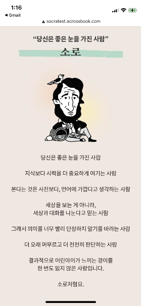 그럼에도 사람들은 왜 아직도 하고 있고 왜 공유를 하고 얘기를 나눌까. 나는 소로 결과가 나온 페이지를 왜 굳이 캡처해서 저장해두었을까. 곰곰이 생각해보면 저 페이지에서 설명하는 소로의 성향, 즉 나의 성향이라고 말하는 그 내용이 마음에 들었기 때문인 것 같았다. 소로를 빌려 내가 이런 사람이라고 듣는 것이 기분이 좋았기 때문에 친구들에게 그 결과를 공유하지 않더라도 굳이 혼자 캡처해서 간직해둔 것이다.