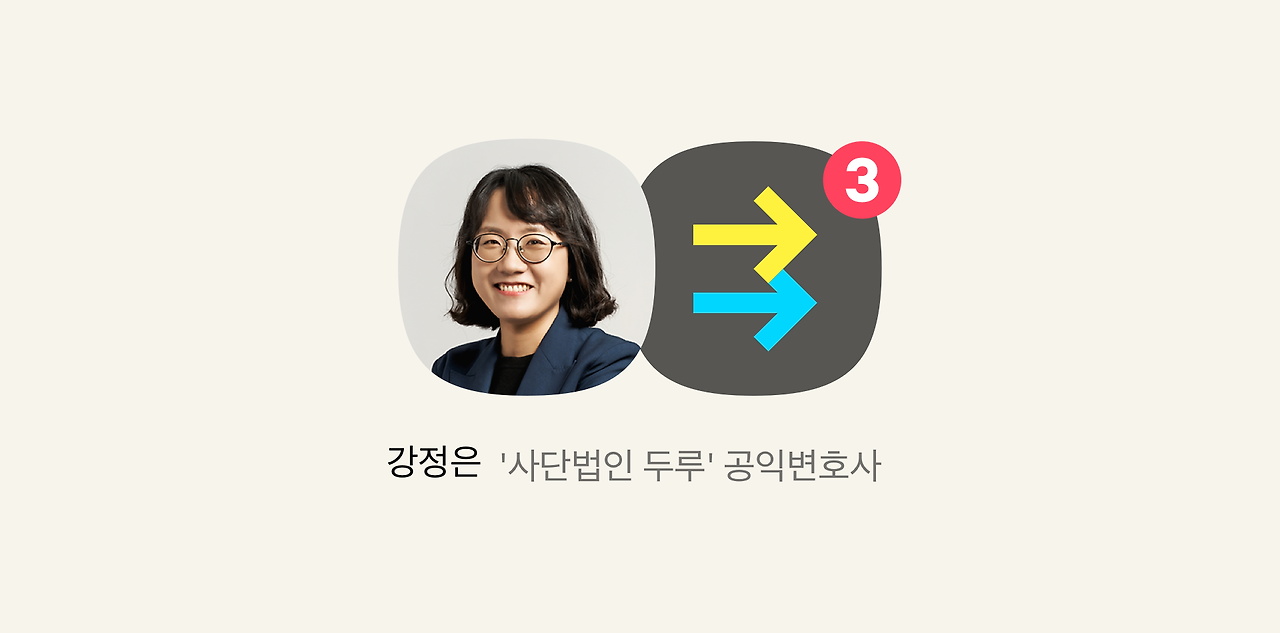 안녕하세요, 변호사 강정은입니다. 저의 경력은 모두 공익 활동으로 채워져 있어요. 변호사 시험에 합격한 직후부터 비영리 공익변호사 단체인 ‘사단법인 두루’의 설립을 도왔고, 지금까지 상근 변호사로 일하고 있습니다.