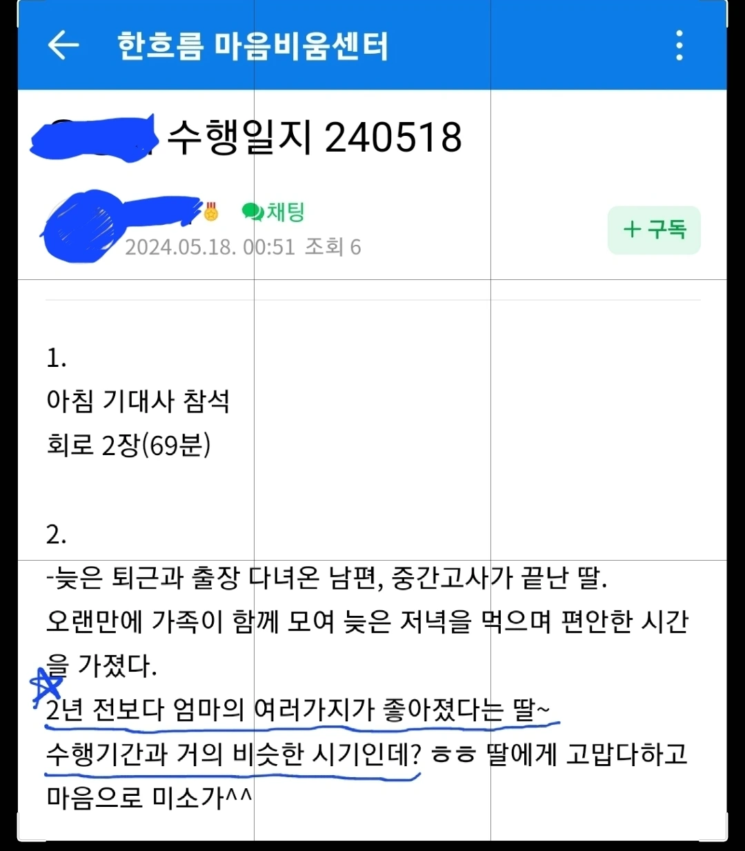 청주의 명상 회원님 좋은 소식 있기에 미소 함께 나누고자 글 올려봅니다.