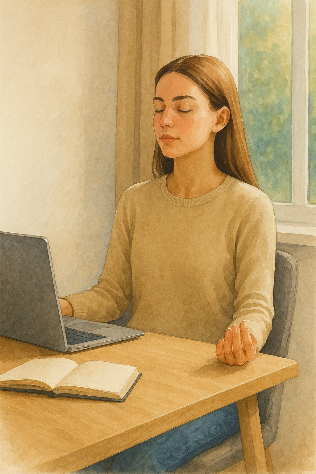 노트북을 앞에 둔 책상에 앉은 채로 마음을 살피고, 다시 호흡을 가다듬습니다.