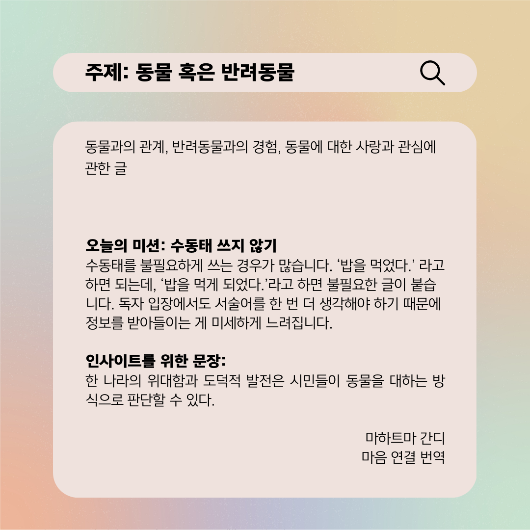 인스타그램 @nousandmind 마음번역유년 시절을 보낸 마당 넓은 집에는 강아지, 고양이, 병아리가 우리의 친구였다. 새끼 고양이를 쓰다듬으며 안고 다녔고 하얀 누렁이 꼬리 잡기 놀이도 했다. 어떤 날은 병아리를 노리는 쥐를 쫒아서 우르르 뛰어다니기도 했다. 이미 경험을 해봐서였을까 동물에 대한 거부감도 없었지만, 애완동물을 기르고 싶다는 동경도 없었다.