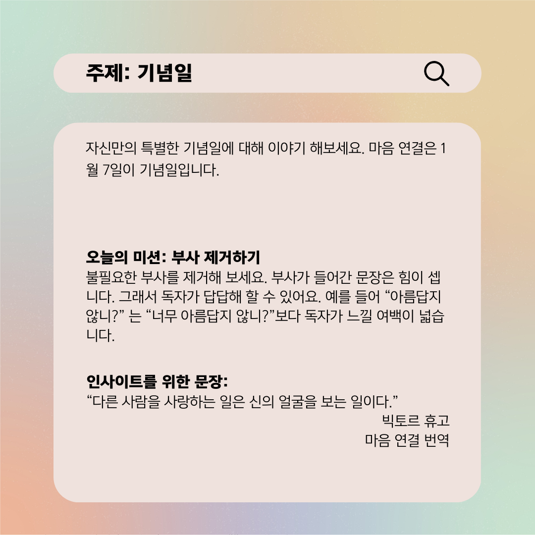 인스타그램 @nousandmind 마음번역기념일을 검색하면 표준대국어사전에 축하하거나 기릴 만한 일이 있을 때, 해마다 그 일이 있었던 날을 기억하는 날로 되어있다. 그런 의미에서 내 생일이 떠오른다. '살다 보니 생일인 것도 몰랐어요', '생일에 의미를 두지 않아요', '생일이 별거예요? 그냥 살아가는 날 중 하루예요'는 나와 거리가 멀다.