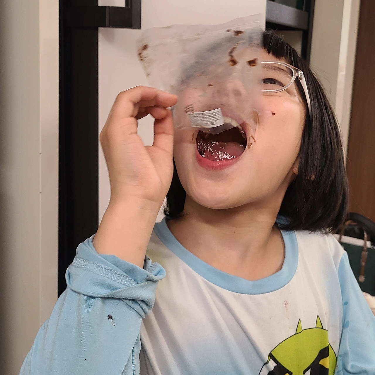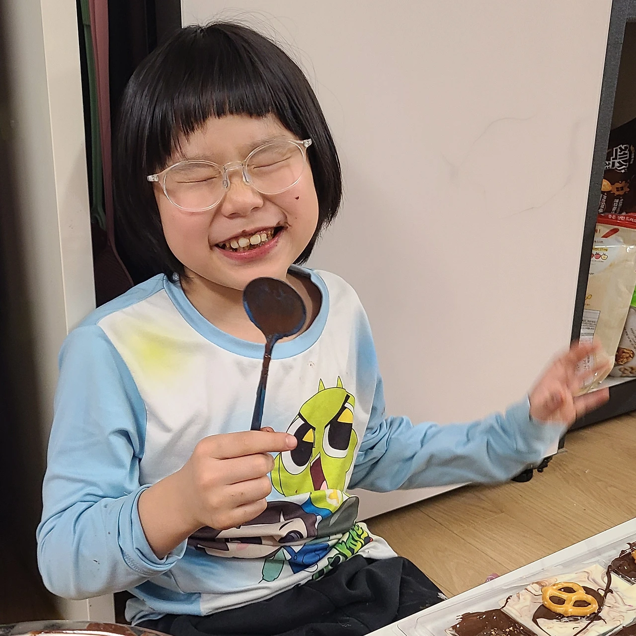 아이와 하다 보니 벌써 준비한 재료들이 바닥을 보여요. 다행히 초콜릿도 얼마 안 남았어요. 바닥을 박박 긁으니 한 스푼이 나와서 아이에게 선물로 내밀었답니다. 아이가 손가락 대신 숟가락을 빨며 맛나게 잘 먹네요. 그러더니 남은 캔디가루를 들고 눈을 빛내길래 먹으라고 했어요. 세상에서 가장 행복한 아이와 좋은 엄마가 되는 순간입니다.