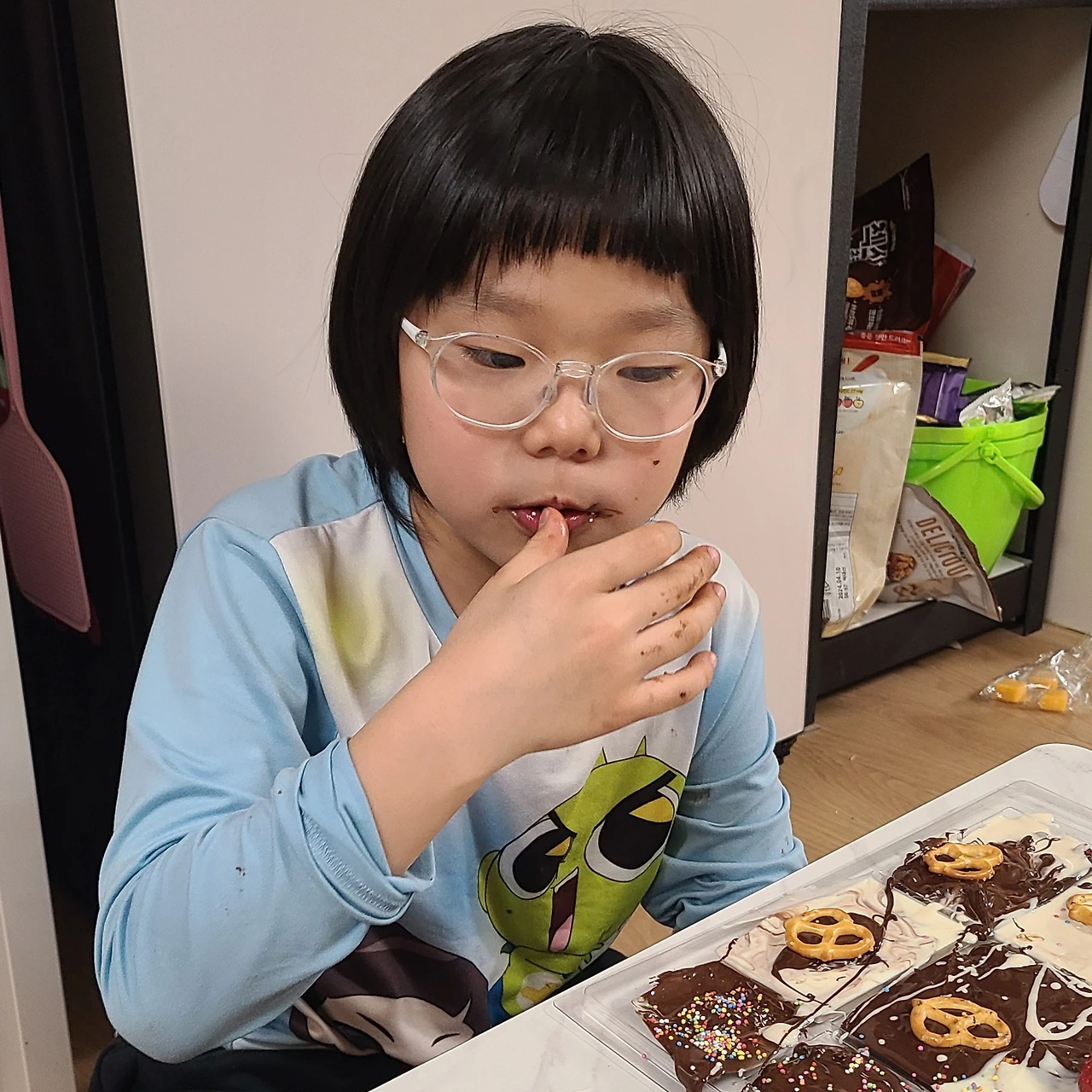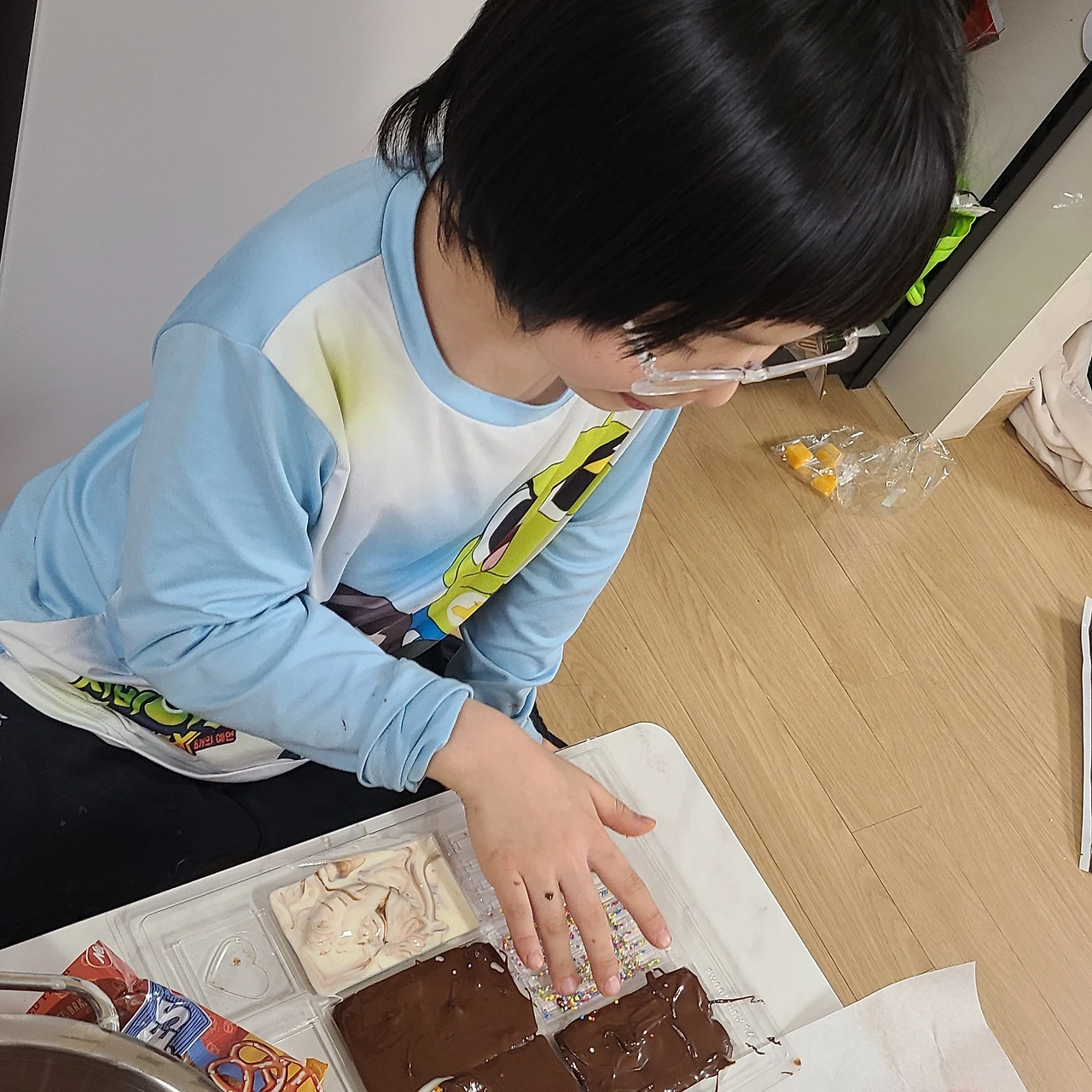 옆에서 뭔가 집중하는 아이를 보니 DIY로 온 초콜릿 틀에 말린 오렌지를 넣고 초콜릿을 열심히 붓고 있네요. 이때도 스푼을 이용했어요. 짤주머니가 있었지만 귀찮음과 아이가 터뜨릴지도 모른다는 불안함에 무조건 스푼으로 했답니다. 스푼으로 열심히 초콜릿을 퍼다 붓더니 마블링이 생긴 게 예뻤나 봐요. 판초콜릿 위에 마블링을 만들기 시작해요. 그리고 마무리로 프레츨과 딸기 캔디가루를 뿌리고는 감탄을 하네요. 이럴 때는 더 격하게 동감해줘야 해요! 그렇게 감탄과 공감이 섞인 감감초콜릿도 완성입니다.