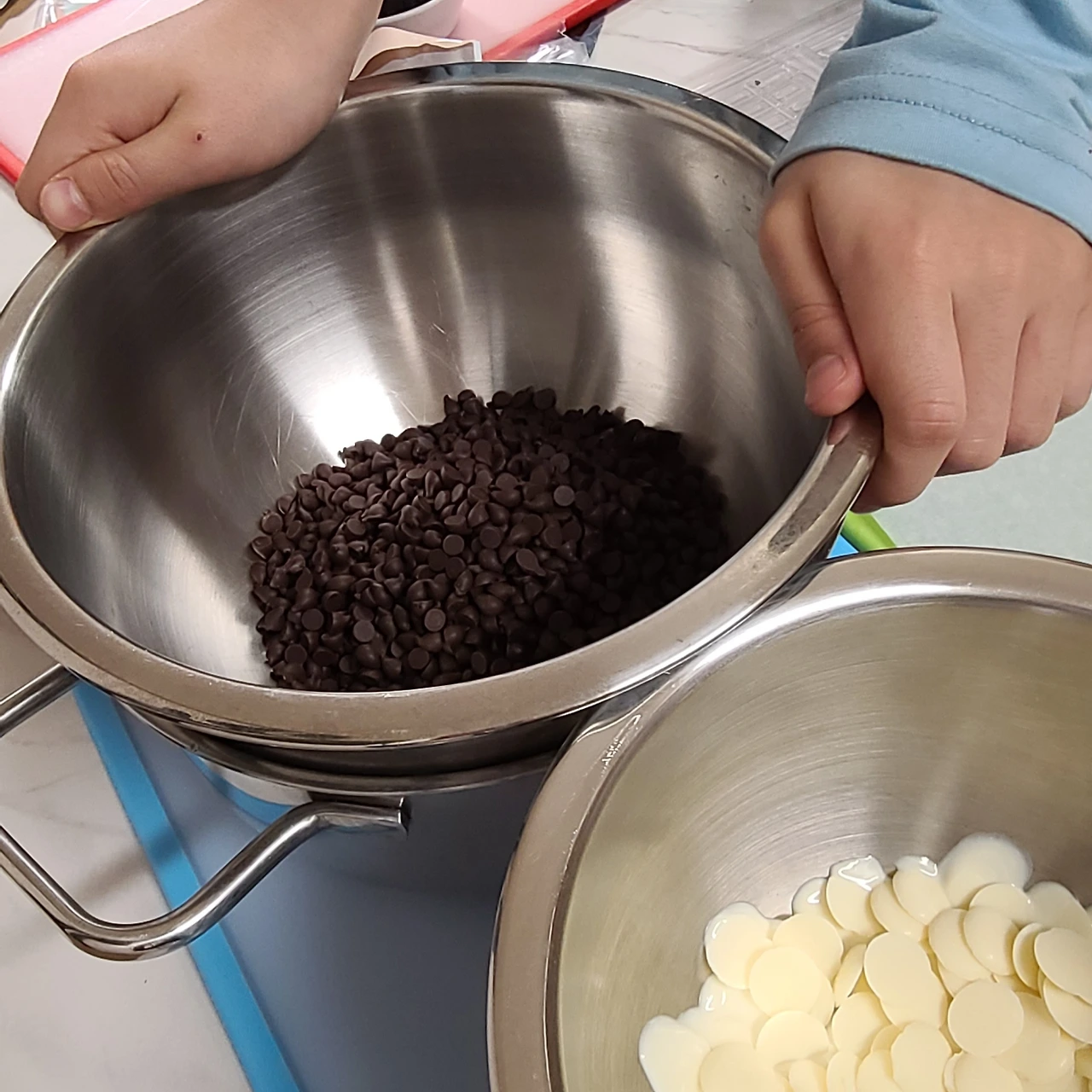 열 전도율이 높은 스테인리스 볼을 냄비에 얹어주고 하나에는 화이트 초콜릿을, 다른 하나에는 다크 초콜릿을 넣어주면 금세 사르르 녹기 시작합니다. 모든 게 궁금한 아이는 마구 젖기 시작하네요. 아직 힘조절이 안 되는 나이인지라 초콜릿이 사방으로 튀지 않게 살살 저으라고 꼭 말해줘야 해요. 초콜릿이 순식간에 다 녹아버렸어요!