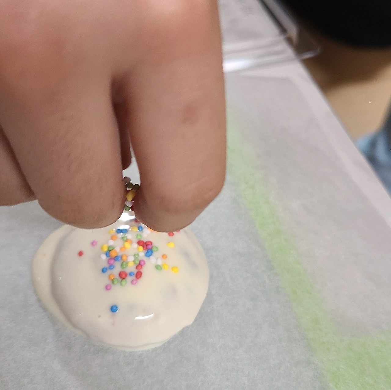 이제 먹고 싶은 재료를 초콜릿에 담가 보세요. 저는 일단 초코칩버터쿠키를 투하하고 야무지게 윗면 아랫면 골고루 묻힌 후에 스푼으로 떠서 종이포일에 얹었어요. 아이가 캔디 가루로 데코레이션도 예쁘게 해 주니 예쁜 화이트 초콜릿 쿠키가 완성되었네요!