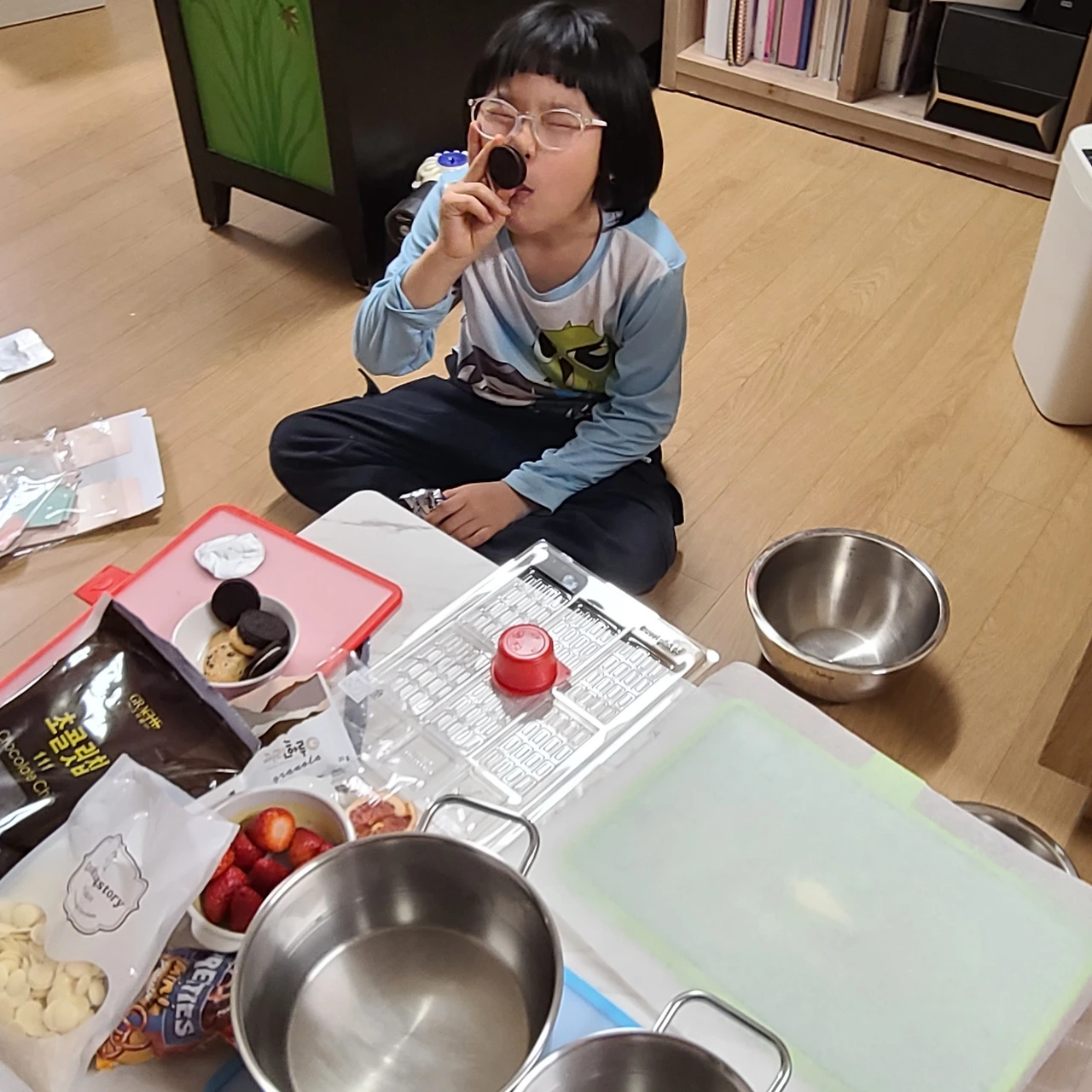 제일 먼저 냄비 2개에 물을 끓이는 동안 종이포일을 넓적한 도마 크기로 잘라 판을 만들고 재료들을 세팅합니다. 정수기의 뜨거운 물로 해도 되지만 저는 끓였어요. DIY 세트 하나와 그나마 성분이 괜찮은 다크 커버처를 추가로 준비했어요. 쿠키는 DIY세트에 있던 오레오와 미니프레츨만 준비했는데 아이가 쿠키박스에서 먹고 싶은 과자들을 가져와서 더 풍성해졌어요. 아이에게 과자 봉투를 까달라고 하니 먹기 바쁘네요.