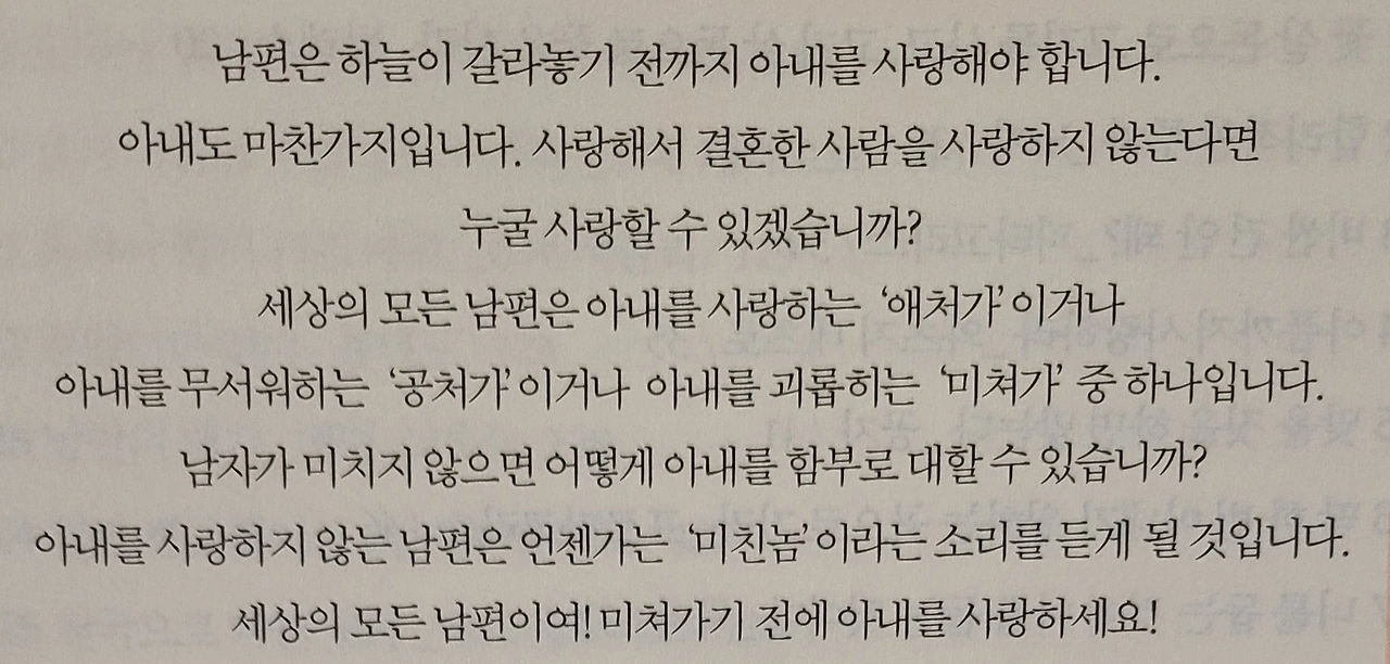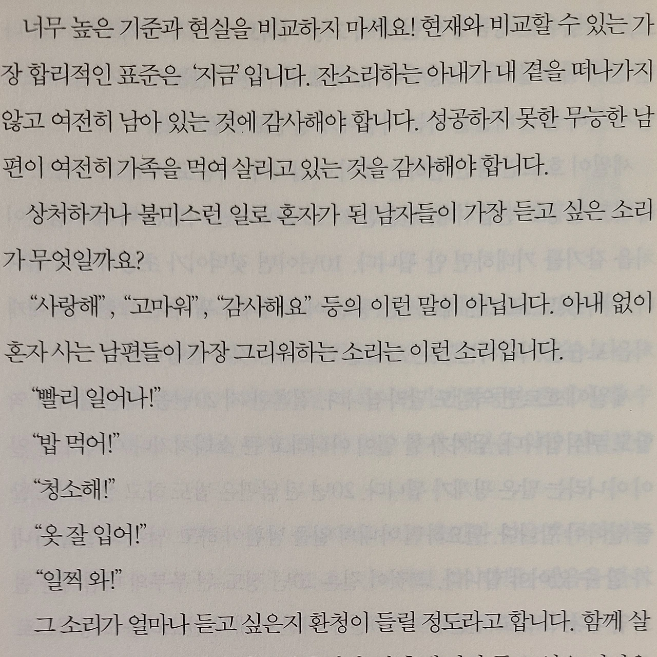 아내가 정말 소중하게 다루어야 할 대상은 새로 산 신발이나 명품 가방이 아닙니다. 가방의 얼룩을 지우기 위해 아끼던 콜드크림을 듬뿍 바르고도 상처가 날까 살살 문지르듯 남편을 대해야 합니다. 아무리 소리치고 거칠게 다뤄도 저녁마다 집으로 들어오니까 막 대해도 된다고 생각하면 안 됩니다. 거친 남자의 가슴속엔 누군가에게 보살핌을 받고 싶어 하는 어린아이와 같은 여린 마음이 들어 있습니다.