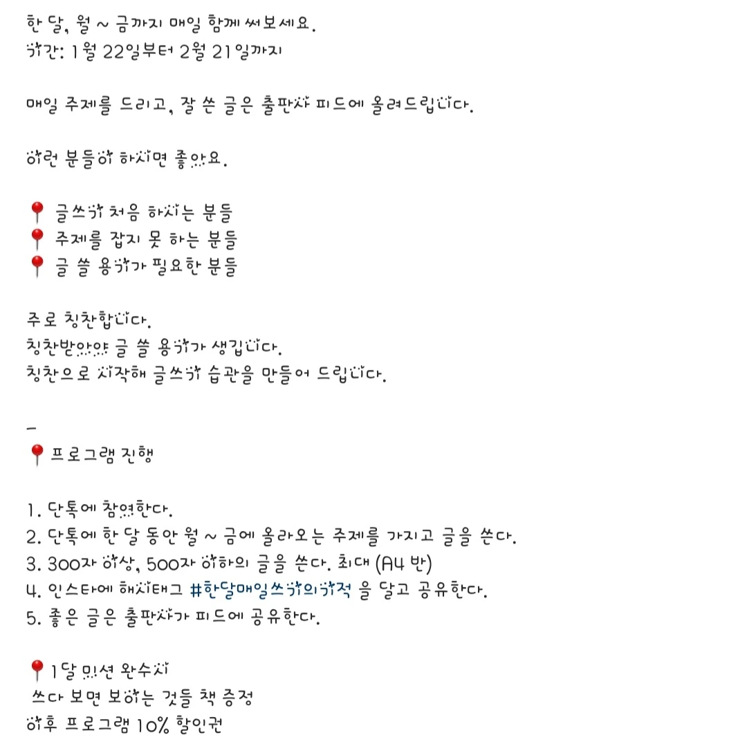 여러분, 처음 시작은 일단 가볍게 쓰는 거예요. 흔히들 술술술 쓴다고 이야기하죠? 좀 엉성하면 어때요? 처음엔 쓴다는 행위 자체에 의미를 두는 게 좋습니다. 우선 많이 써보는 게 글쓰기 실력 다음 단계로 뻗어나갈 수 있는 지름길이니까요. 오늘 이 한 편의 글만 쓰고 앞으로 영영 절필할 게 아니잖아요. 우리는 내일도 쓰고 모레도 쓰고 한 달 뒤에도 쓸 거니까 '오늘 조금 못 써도 된다, 다음에 더 잘 써야지'라고 너그럽게 받아들이고 시작하세요.