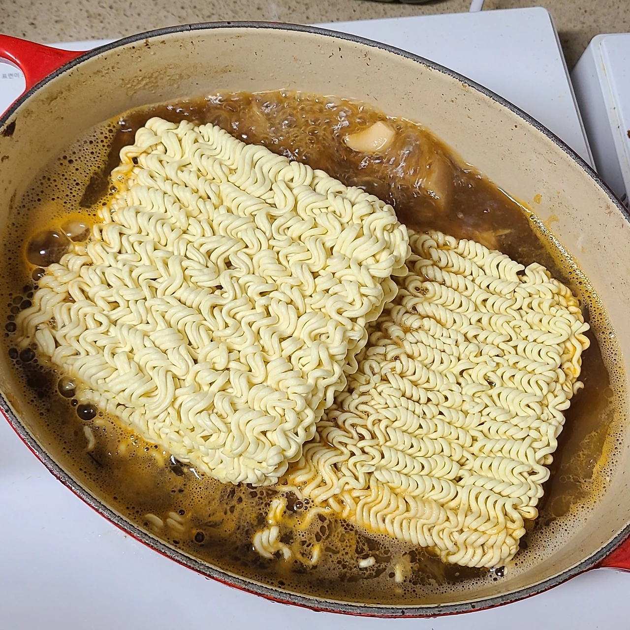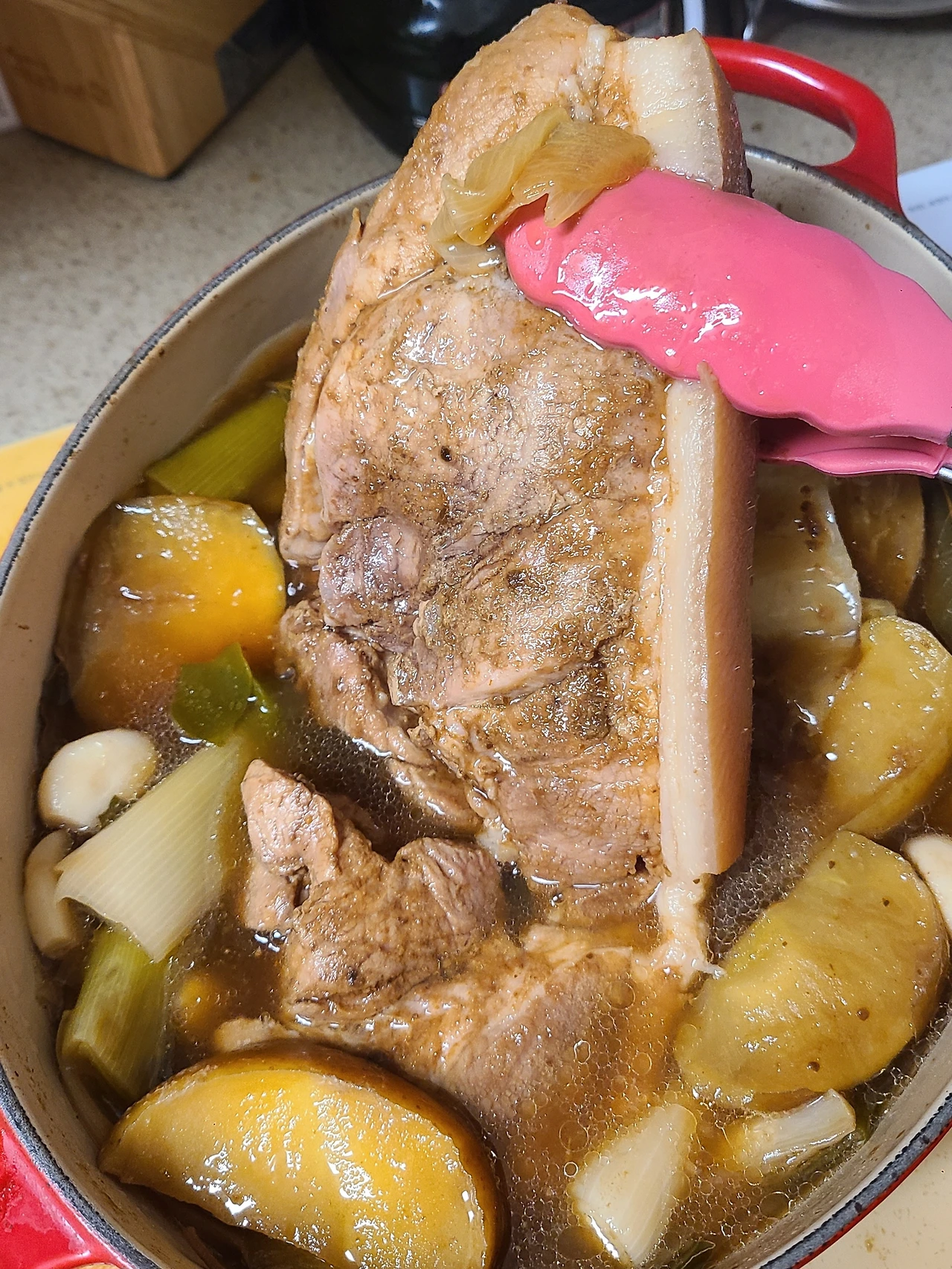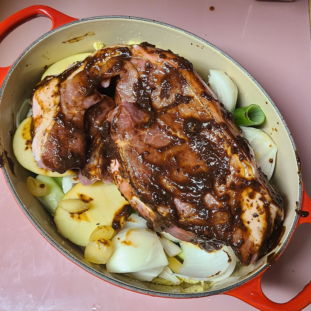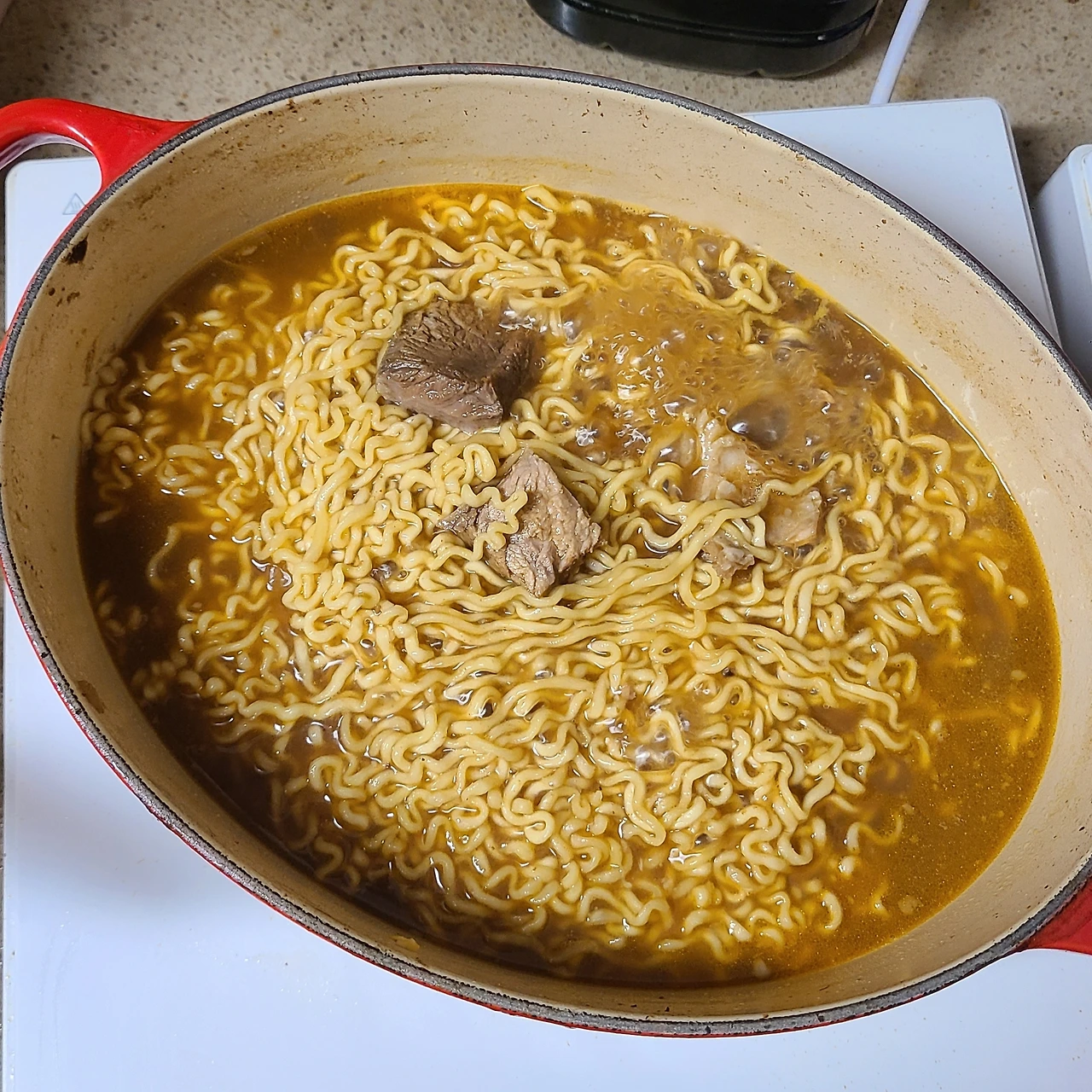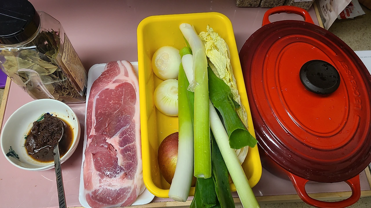 혼수로 준비해 온 12년 묵은 르크루제를 꺼내 재료를 넣고, 된장소스를 고기에 바르고, 물도 대충 붓고, 1시간 이상을 푹 삶자 화면으로 보던 그 음식이 내 앞에 있다. 우리 세 식구 든든히 먹고 남은 수육 국물에 라면을 끓여 먹으니 세상에 이거 내가 한 거 맞나 싶다.