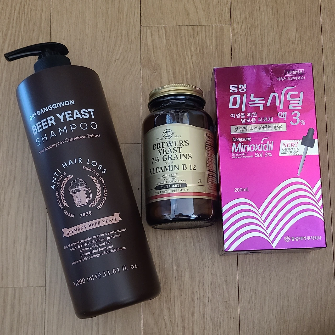 40대에 탈모로 인해 머리를 심으셨던 아버님 덕에 20대부터 탈모관리를 하던 신랑은 누구보다 나의 걱정에 공감을 해주었다. 그리고 나에게 안겨준 3가지가 있었으니 바로 맥주효모 샴푸와 솔가 브루어스 이스트, 그리고 미녹시딜 여성 탈모증 치료제였다. 일단 4개월은 감고 먹고 발라보라고 사서 안겨주며 소분까지 해주니 아주 바람직한 탈모동지다.
