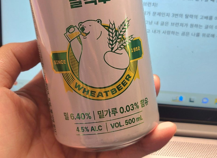 곰처럼 듬직하고 묵묵한 나의 어린 신랑이 첫 번째 곰이고, 스위트하고 위트 있는 밀맥주 곰표가 두 번째 곰이다. 첫 번째 곰과 함께 마시는 두 번째 곰은 정말 더할 나위 없이 나를 행복하게 해 준다. 난 일주일에 두 번은 곰과 함께 곰표를 마신다. 그런데!! 일주일째 곰표를 못 마시고 아니 안 마시고 있다.