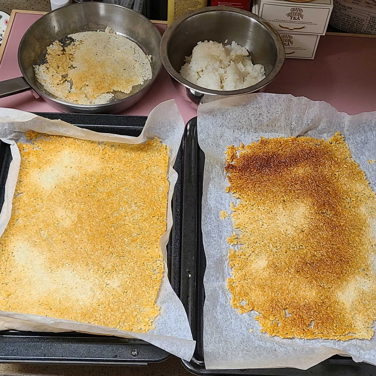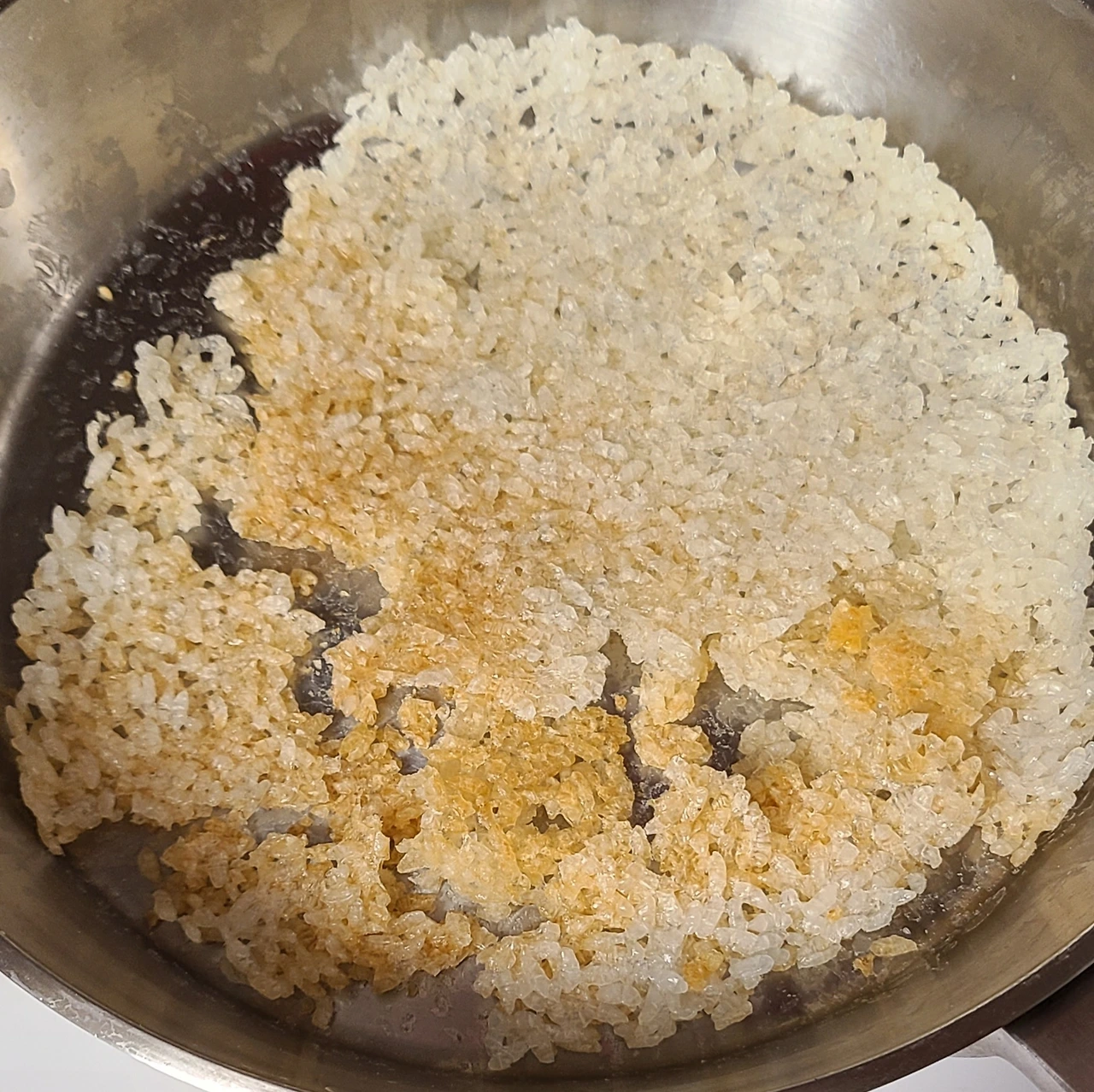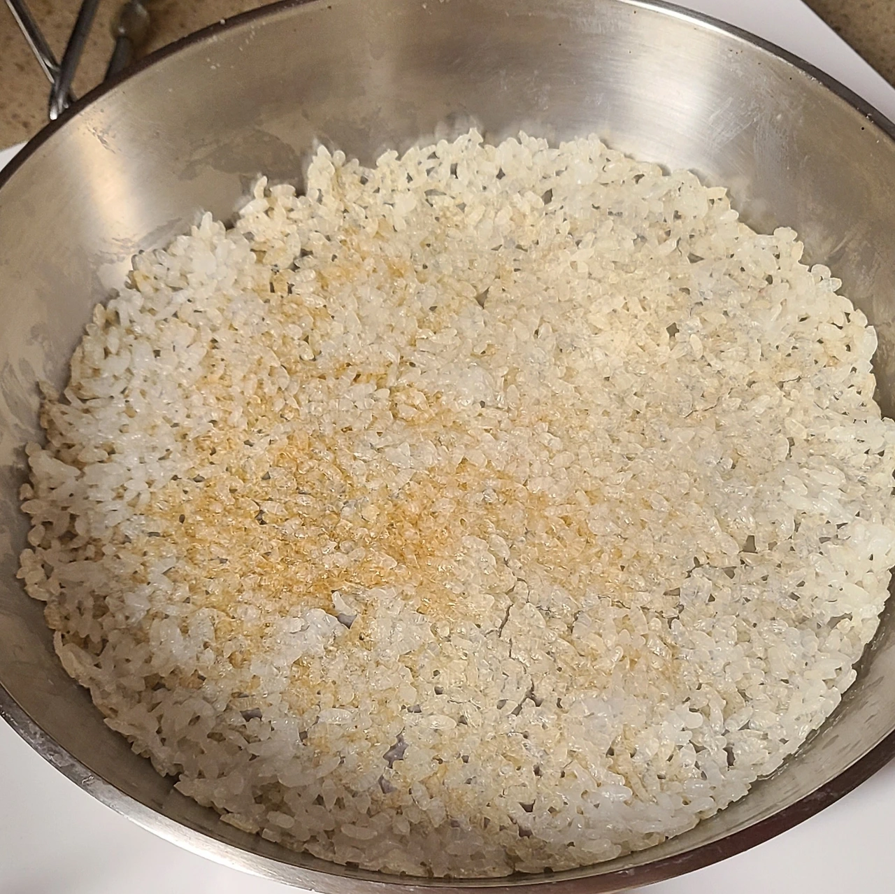 프라이팬에 밥을 두껍게 펼치고 누르지 않은 상태에서 약불로 구워주세요. 타닥타닥 소리는 나지만 윗부분의 수분이 유지되는 그때를 놓치면 안 돼요. 아! 놓쳐도 돼요. 누룽밥을 하면 되니까요.