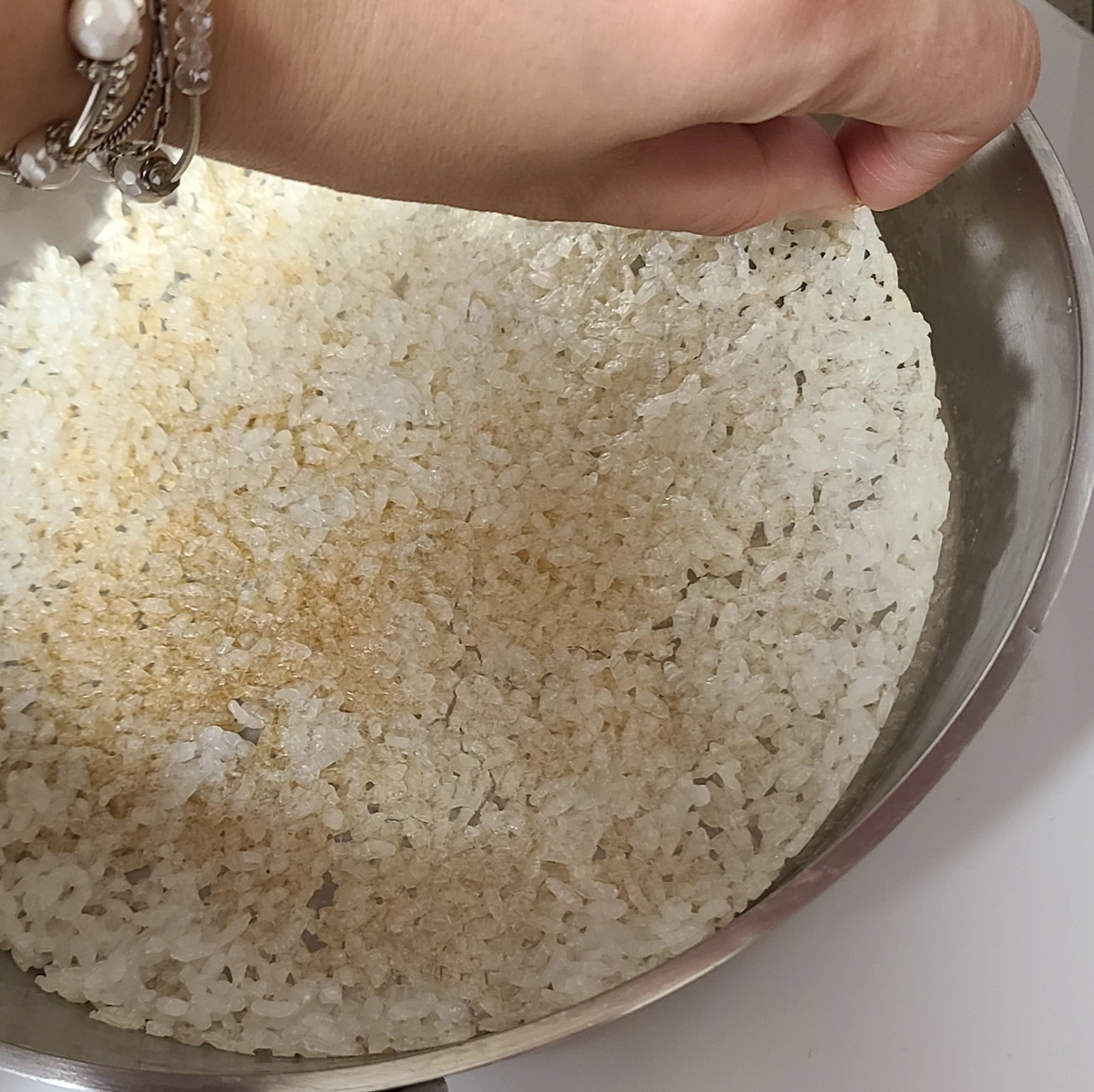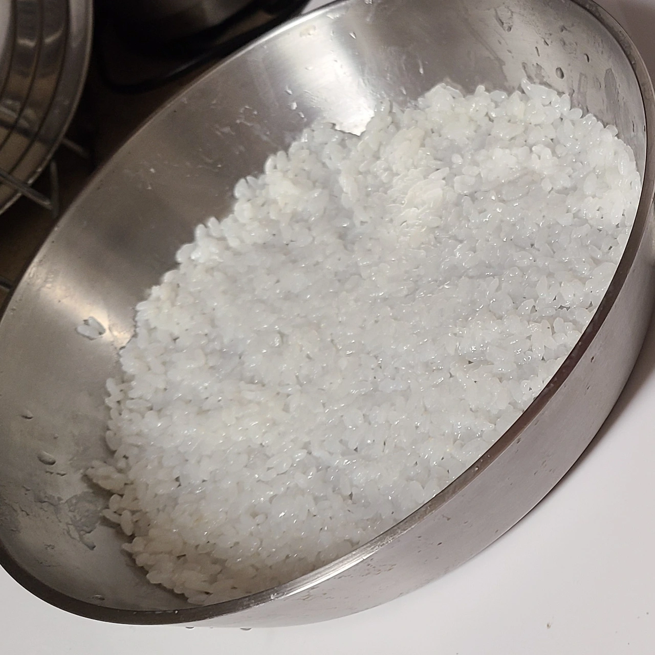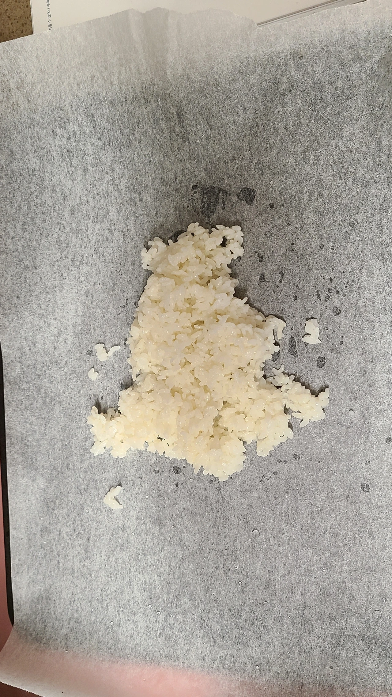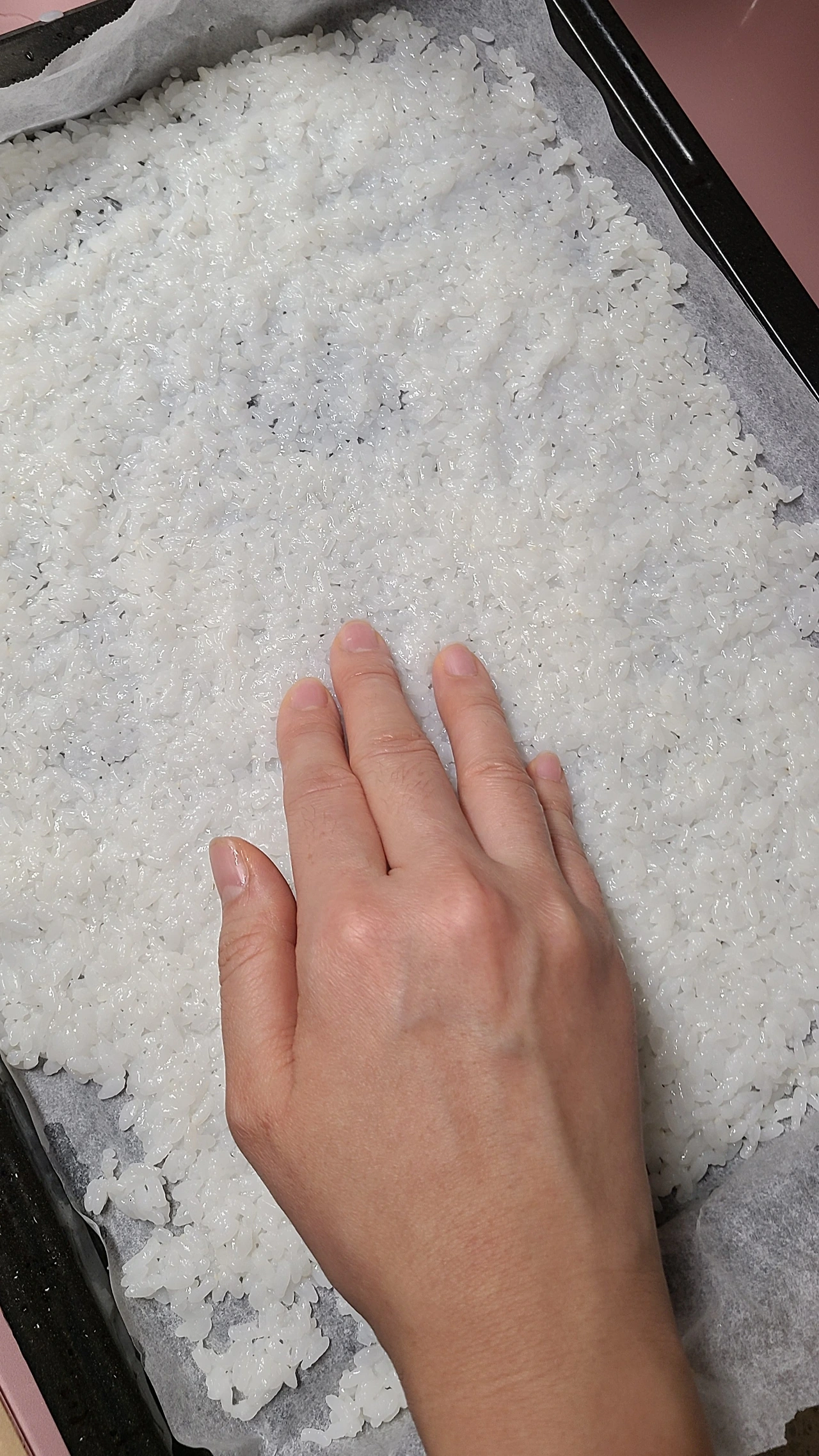 물기 묻히기 싫다 싶은 분이 계시다면 그냥 해도 되지만 밥알이 손에 달라붙을 거예요. 비닐장갑이나 니트릴 장갑을 껴도 되는데 저는 맨손으로 할 때가 더 잘되더라고요. 하다 보면 본인한테 맞는 방법을 찾으면 됩니다.
