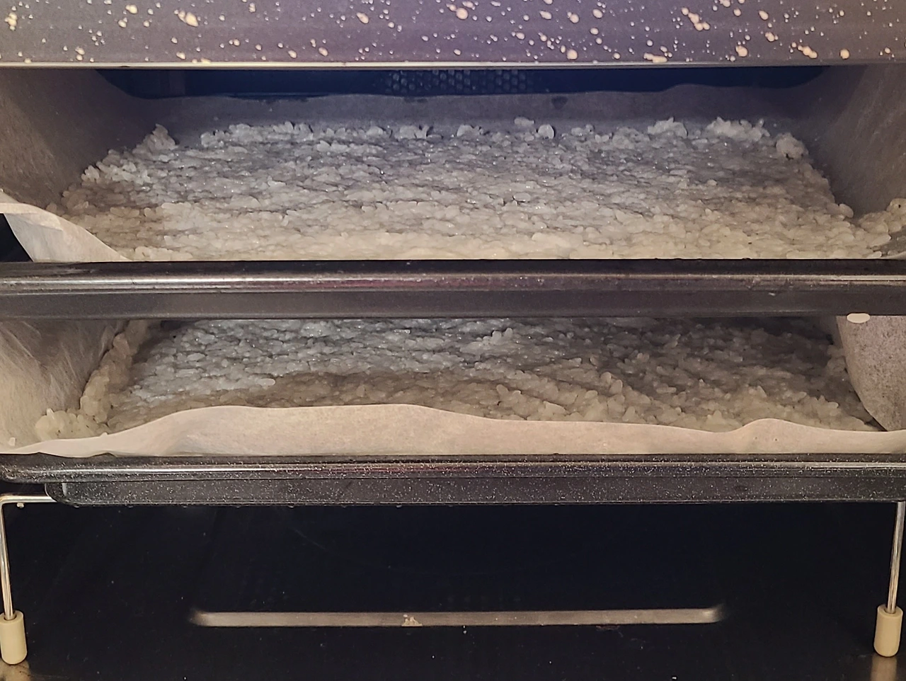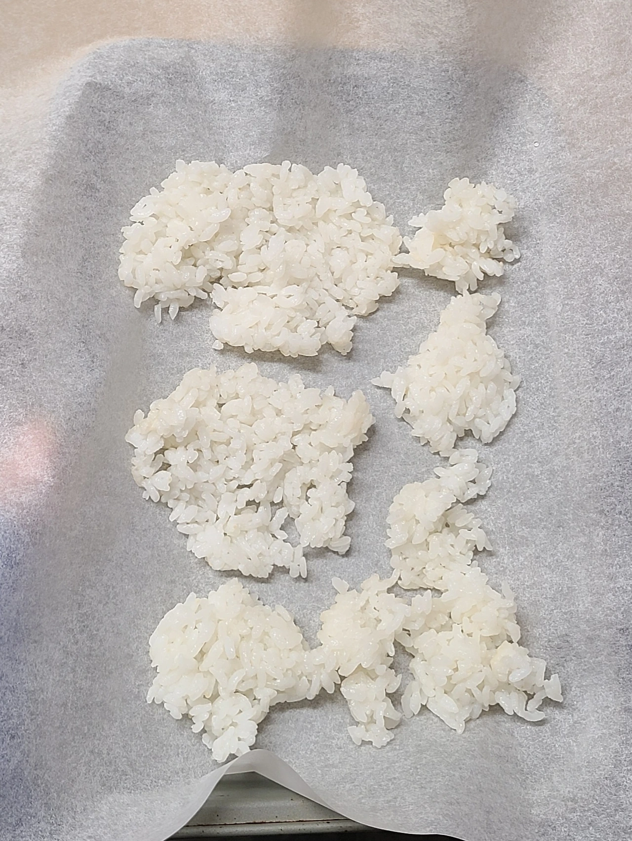 집에 오븐만 있는 관계로 오븐으로 만들어 보겠습니다. 동생의 경우는 에어프라이로 만들고 있고 만드는 방법은 동일해요. 오븐 용기에 종이 포일을 깔고 밥을 올려놓습니다. 첫판에는 3 주걱을 펐는데 밥양이 좀 많이서 두 번째 판에는 크게 한 주걱을 푸니 딱 좋았습니다.