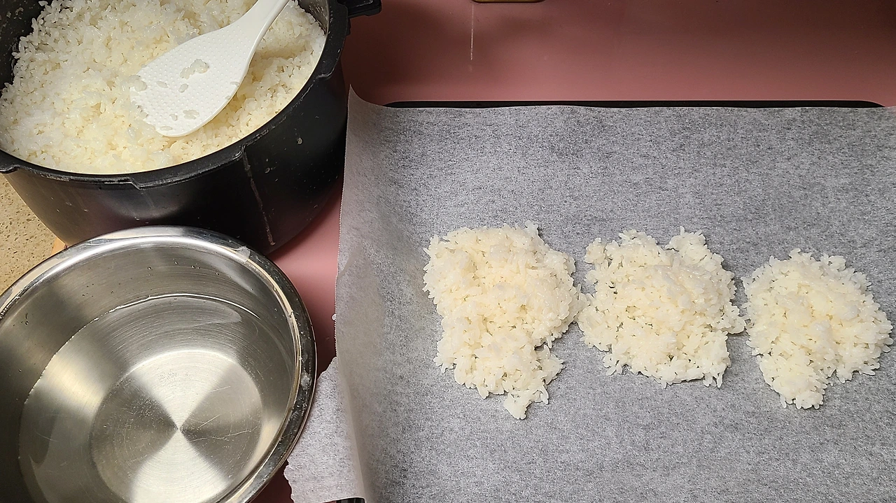 - 밥 (갓 지은 밥 추천) - 오븐 또는 에어프라이 용기 - 종이포일 - 넓적한 프라이팬 - 손이 들어가는 볼 - 식수 500ml