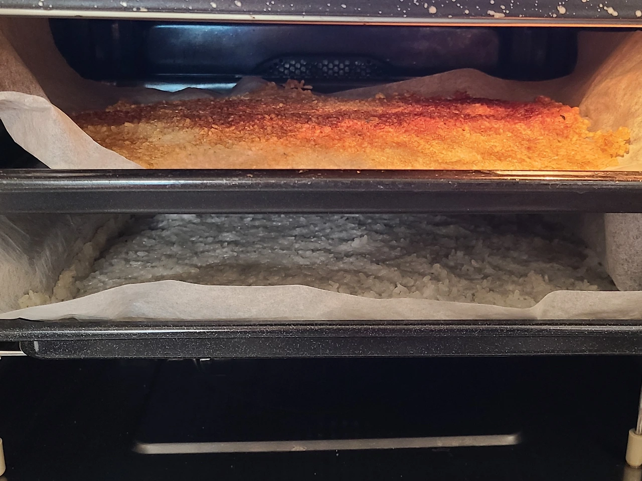 드디어 밥으로 부침개 자태를 만들었으면 오븐에 넣고 200도 20분 예열을 해줍니다. 180도 20분도 괜찮아요.