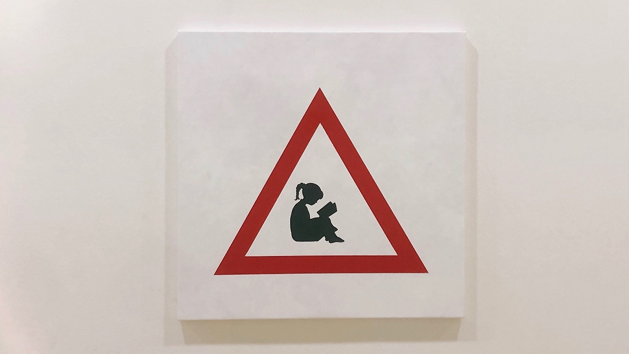 <책 읽는 소녀(girl is reading)>(2019)를 살펴봅시다. 금지를 뜻하는 빨간 삼각형 안에는 독서를 하고 있는 한 소녀의 모습이 그려져 있습니다. 읽는 행위는 계몽의 역사에서 빠지지 않고 언급되는 가장 중요한 행위입니다. 따라서 이슬람 사회에서 여성이 ‘읽는다’는 곳 눈을 뜨는 것을 의미할 것이며, 이는 남성 중심적 사회를 단단하게 지탱하고 있는 부조리하고 편협한 지식 체계를 뒤흔들만한 위협의 여지가 있음을 의미할 것입니다.