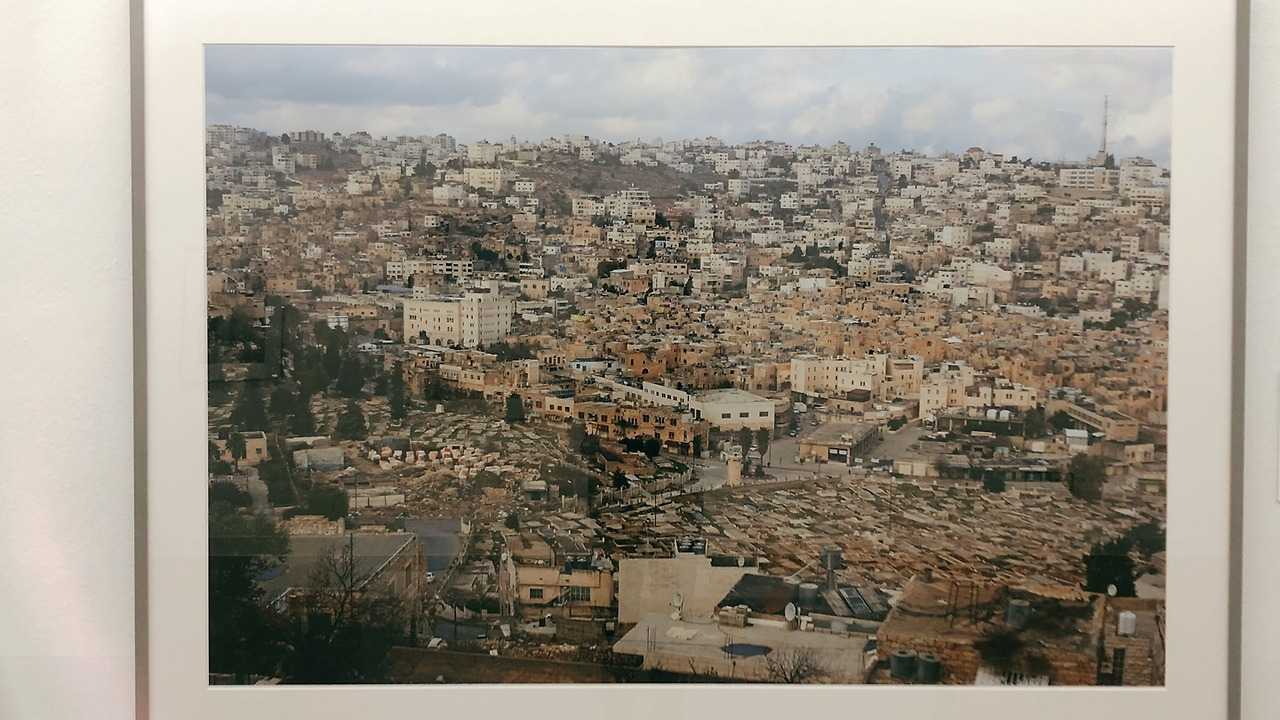 알 라마 산에서 본 풍경을 찍은 이 사진은 우리에게 익숙한 팔레스타인 혹은 이스라엘의 풍경입니다. 촘촘히 붙어 있는 사각형 모양의 베이지색 집들과 곳곳에 자리 잡은 상점들의 모습은 많은 사람들이 살아가는 활기 로운 거리의 모습을 떠오르게 합니다. 그리고 실제로 이 곳은 팔레스타인 국민들이 자유롭게 오고 가며 물건을 거래하던 알 슈하다 거리입니다.