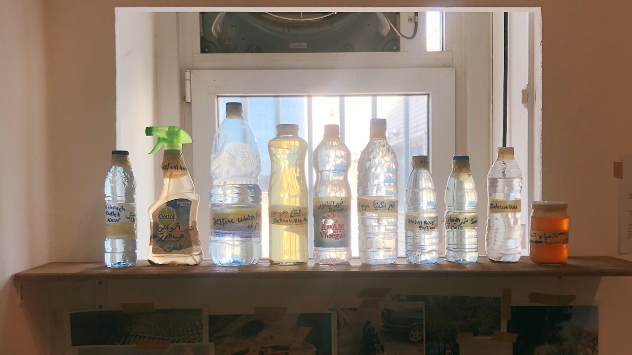 <아랍어로 된 갈증의 뉘앙스>는 레바논과 시리아 각지에서 모은 39개의 페트병에 물을 담아 설치한 작품입니다. (서울 전시장에는 일부만 설치되어 있습니다.) 이른 오전 시간 전시장을 방문했더니, 페트병을 투과하는 빛이 강하고 선명했습니다. 언뜻 보기에는 전시장 한켠에 드는 자연광의 아름다운 때문인지, ‘미적'이라는 느낌이 물씬 풍기는 작품입니다.
