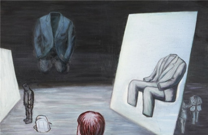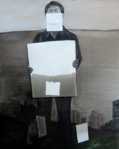 <말의 시작>에서는 발화할 수 없는, 1인 시위자가 그려져 있습니다. 언론, 특별 조사 위원회, 진상 규명… 캔버스 위 글자들은 희미하고, 읽히지 않습니다. 흔적만 남은 피켓을 들고, 소리를 치지만 있지만 관람객들은 아무것도 들을 수 없습니다. <말의 시작>은 고발의 언어가 사라진 이미지를 통하여 세월호 진상 규명을 외쳤지만, 그 어떤 목소리도 들리지 않았던, 공허한 외침의 기록을 담아냅니다.