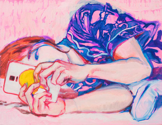 나수민의 <젊음>을 보면, 전반적으로 화려한 형광 색감이 눈에 띕니다. 청춘의 색으로 분류될 법한 채도 높은 형광 핑크 물감이 작품 곳곳에 묻어납니다. 그러나 작품 속 인물은 우리의 쓸쓸하고, 우울하고, 공허함을 느끼는 청년입니다. 나수민 작가는 하루하루 버티며 살아가지만, 이 조차도 쉽지 않은 청춘들을 주목합니다. 이십 대 후반인 필자 역시 공감되는 지점이 많아 그림 앞을 떠나기가 좀처럼 쉽지 않았습니다.