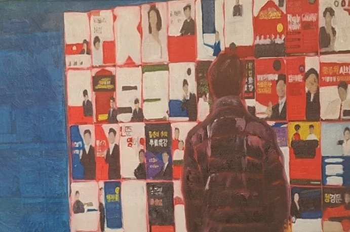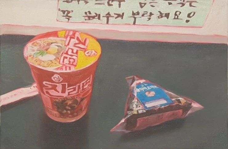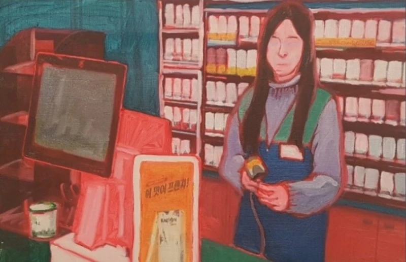 작가의 작품에서 청춘은 이전처럼 활기와 어울림으로 대변되지 않습니다. 미래를 향해 나아가는 열정 넘치는 젊은이들의 모습은 어디서도 찾아볼 수 없습니다. 나수민 작가가 바라보는 청춘이란, 생활비를 벌기 위하여 아르바이트를 하거나 가만히 누워 스마트폰을 들여다보며 젊음을 흘려보내는 청년의 일상입니다. 착잡한 심경으로 구인 게시판을 기웃거리거나 삼각김밥과 탄산음료로 끼니를 때우기 급급한 젊은이들의 모습입니다.