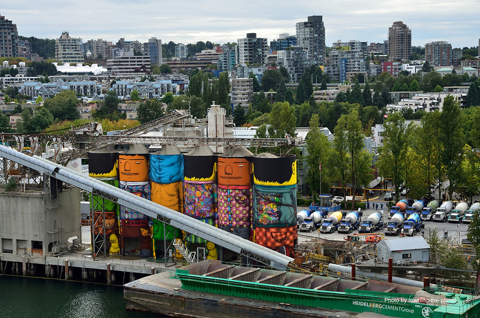 오스제미오스 국내 개인전을 살펴보기 앞서, 이들의 기존 작업을 하나 살펴보고자 합니다. 아마 국내에 소개된 오스제미오스의 가장 유명한 작업은 2014년 벤쿠버 비엔날레에서 소개된 <Giants> 일 것입니다. 오스제미오스는 거대한 시멘트 공장을 하나의 예술품으로 탈바꿈하였습니다. 이 작품은 2014년 봄 제 3회 벤쿠버 비엔날레에 초청되기도 했죠. 작가들은 23m 높이의 거대한 원형 타워에 6명의 거인을 그렸습니다. 작가들은 이 작업을 위하여 중장비를 타고 시멘트 사일로에 직접 올라가 그림을 그렸습니다. 이 작품은 벤쿠버시 최초의 벽화 작품이자, 원형 벽면 구조물에 입체적인 도색을 시도한 최초의 작품으로 꼽히기도 합니다.