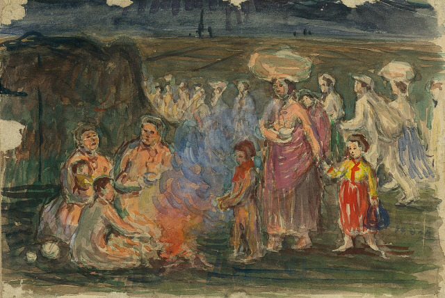 작가가 유독 피란길의 정한을 담은 그림을 많이 그린 이유는 무엇일까요. 그 이유는 작가의 개인적인 사정과 긴밀하게 연결되어 있습니다. 윤중식 작가는 가족들과 남으로 향하는 피란길에 올랐다가 그만 아내와 딸의 손을 놓치고, 홀로 가난 아이와 막내를 업고 부산까지 가야 했습니다. 가족을 잃고 자신에게 달린 어린 자식들을 데리고 홀로 부산으로 가야 했던 작가는 어떤 심정이었을까요.