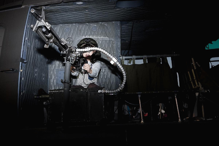 남자아이들의 로망인 총과 탱크를 실물 크기로 볼 수 있는 이 행사장은 세계 무기상들이 모여 계약을 체결하는 곳이자 가족들의 주말 나들이 장소이기도 합니다. 가족애와 주말의 낭만, 그리고 국가의 폭력 수단이 뒤섞인 공간에서 우리는 곧 전쟁과 분단이라는 역사적 사실이 우리의 일상 곳곳에서도 작동하고 있다는 사실에 대하여 마주하게 됩니다. 아이는 사진기 앞에서 천진하게 기관총을 발사하는 모습은 살생의 수단의 일종의 유희가 되어 우리의 일상에서 가볍게 치부되는 현실을 한 번 더 생각하게 하기도 하죠.