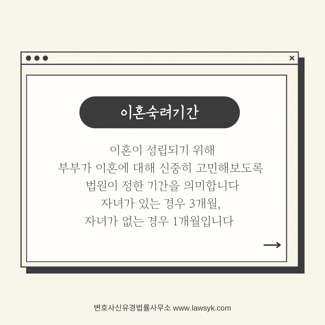 이 때 부부가 진지하게 이혼여부에 대해 고민해보는 시간으로서 ’이혼숙려기간‘이 존재합니다