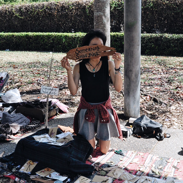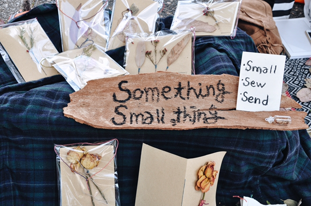 자리를 잡고 가방을 열어 준비해온 물건들을 꺼냈다. something small,thing 컨셉에 맞춰 가지고 있는 물건들로 급하게 준비한 디스플레이. 일주일 간 만든 카드를 설명하는 'small, sew, send'도 적었다.