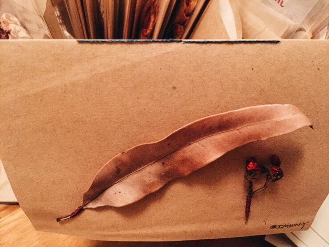 종이를 북바인딩 방법으로 묶고 나뭇잎을 바느질하면 어느 정도 모양이 잡히고.
