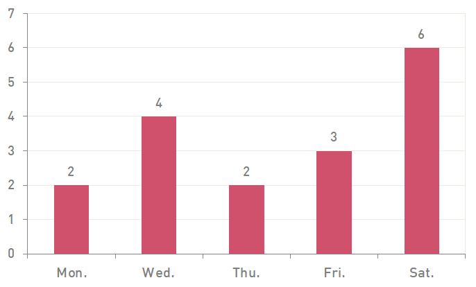 뜬금없지만 문득 브런치 에디션을 마치며 뭔가 통계를 내보고 싶어졌어요. 자랑은 아니지만 저화 호떡은 책에, 브런치 에디션에도 싣지 못할 만큼 많은 횟수를 싸워 왔는데요. 수많은 싸움 중 책에 실을 만큼 대단했던 싸움들은 어떤 요일에 많이 일어났을까 뒤적여보니 놀랍게도 토요일이 6회로 35%의 지분을 차지하고 있었습니다. 그 뒤를 따르는 것은 수요일, 그다음은 금요일, 그 다음은 월요일과 목요일이 총 2회로 12%의 지분을 갖고 있더군요. 아주 많이 싸웠지만 어쩐지 화요일과 일요일만은 저희를 피해 갔었던 모양입니다.