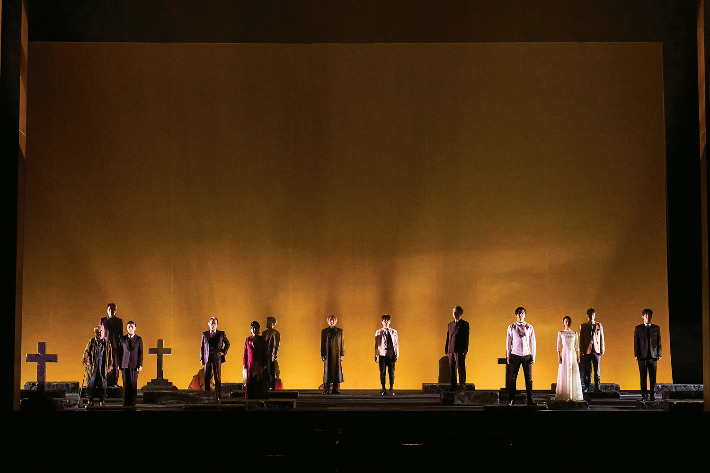 어둑한 무대 자체가 거대한 무덤 같이 느껴진다. 그리고 불필요한 설정이나 소품이 없이 깨끗하다. 캐릭터의 감정 그 자체로만 끌고 갈 수 있도록 최소한의 도구와 구조물만 있다.