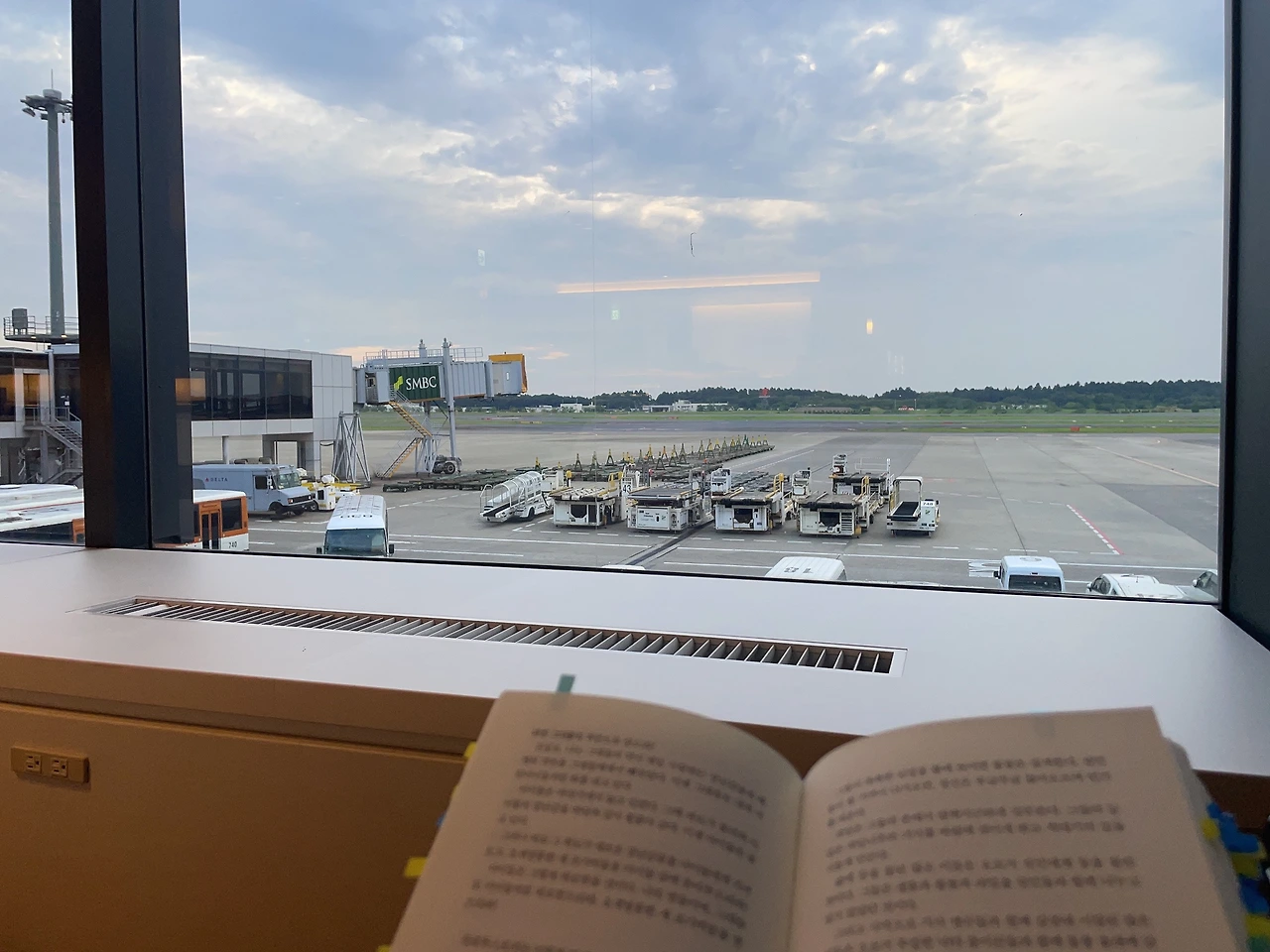아이스커피 내려서 원샷 때린 후에 조용하고 시원한 곳에서 공항 풍경을 보며 책을 읽으니 낙원이 따로 없었다. 사진 왼쪽으로 보이는 게이트가 내가 탑승할 게이트였다. 게이트가 바로 보이니 더 안심(?)이 되고 여유롭게 시간을 보낼 수 있었다. (내가 탈 비행기가 들어오는 것도 볼 수 있었다. 20:20에 비행기가 들어왔고, 승객들이 한참 내렸다.)