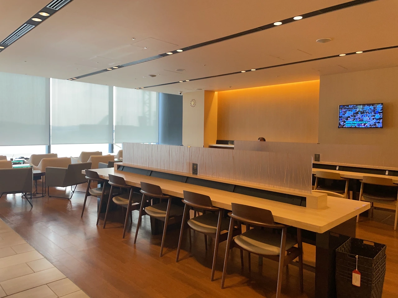 소파, 책상 등 원하는 스타일의 좌석을 골라 앉을 수 있고, 자리도 매우 여유 있었다. 비행기 출발 정보도 볼 수 있고, 간단한 스낵과 음료를 제공한다. 음식(식사, 디저트, 주류)은 별도로 결제해야 한다.