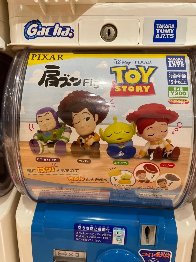 그렇게 애매한 정체성으로 살아가던 중 모 쇼핑센터에서 여자친구와 데이트를 하다가 ‘토이스토리’ 장난감이 들어있는 가챠(뽑기) 머신을 마주했다. 평소 ‘알린’이라는 캐릭터를 좋아하던 여자친구를 위해 언제 마주칠지 모르는 타코야끼 트럭을 기대하며 지갑에 아껴둔 오천 원짜리 지폐를 희생하기로 마음먹었다. 우리의 앞엔 마찬가지로 해당 가챠 머신을 그냥 지나치지 못한 초등학생 정도의 아이와 그의 어머니가 이미 지폐를 동전으로 바꾸고 있었다. 어머니께선 아들의 손을 잡아 직접 손잡이를 돌리게 했고, 굴러 나온 플라스틱 공을 손으로 가리며 그 안에 무슨 캐릭터가 있기를 원하냐고 물었다. 다소 소극적으로 보이는 아이는 고민 끝에 ‘우디’를 원한다고 말했다. 그러자 기적처럼 공 속에서 우디가 등장하는 것이 아닌가!