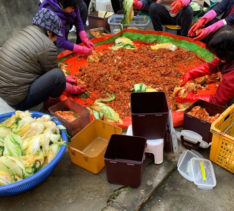 재미있는 사실은 김장의 대부분은 김치를 얻어 가는 우리의 혈육들의 손에 의해서가 아닌, 김장주(농사를 지어 김장을 벌인 고모)의 이웃들이 삼삼오오 모여 빠르게 처리하고 떠난다. 품앗이가 아직 남아 있는데, 우리는 즉 나와 부모와, 고모의 식구들은 그렇게 쉽게 김장을 하곤 했다. 김장의 규모가 크다 보니 김치의 맛도 제각각이었다. 김치 소로 배추를 색칠만 하는 사람이 있는가 하면, 양념으로 배추를 떡칠하는 사람도 있다. 그래서 어떤 집에선 올해 김치가 너무 맵다고 아우성치는가 하면, 어떤 집은 너무 맛있게 먹었다고 하는 웃픈 해프닝도 매해 반복된다. 그게 집단 김장의 묘미 아니겠는가.